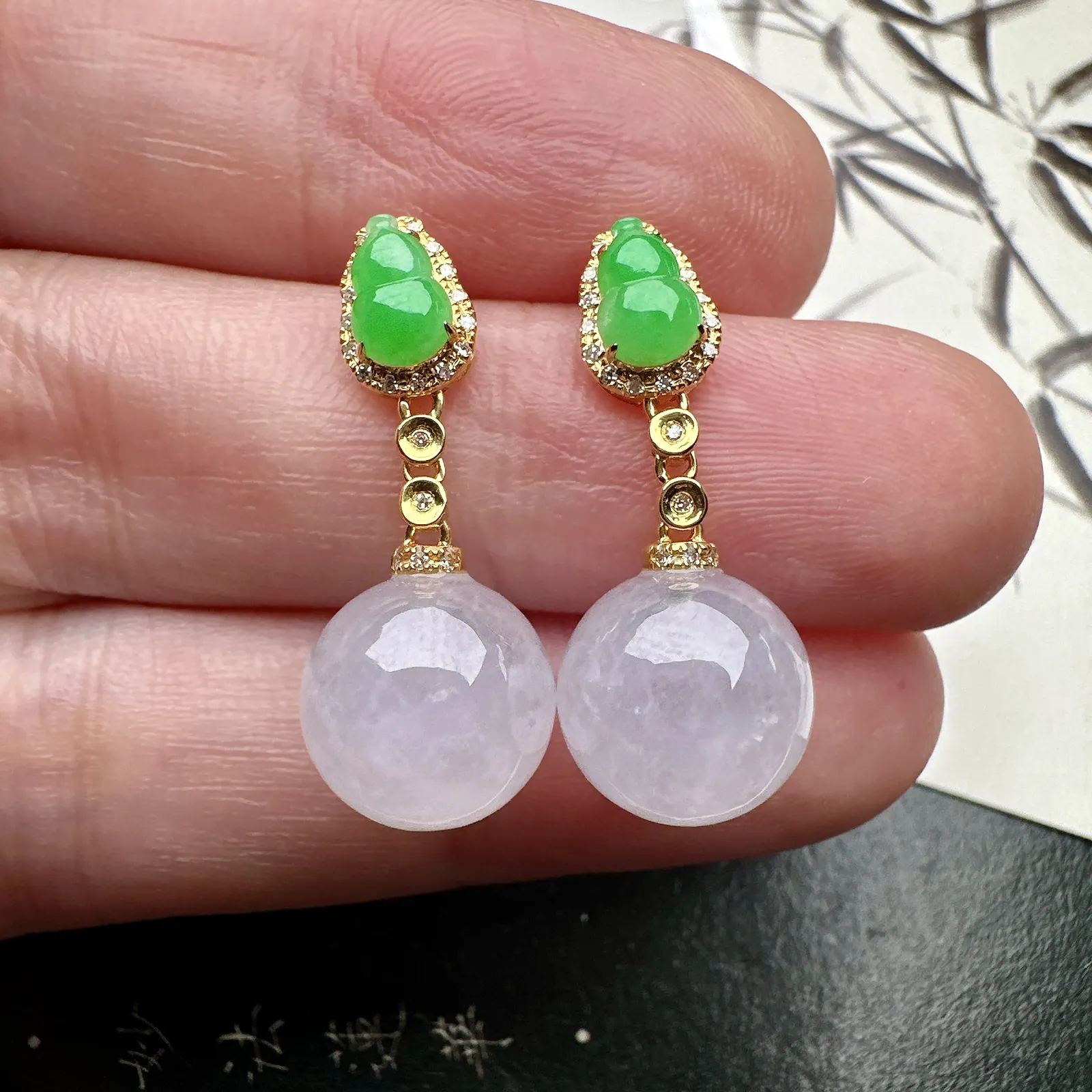 【冰种紫珠耳坠】质地细腻,妖紫色泽,光泽度不错,18k金钻镶嵌,直径10.5毫米