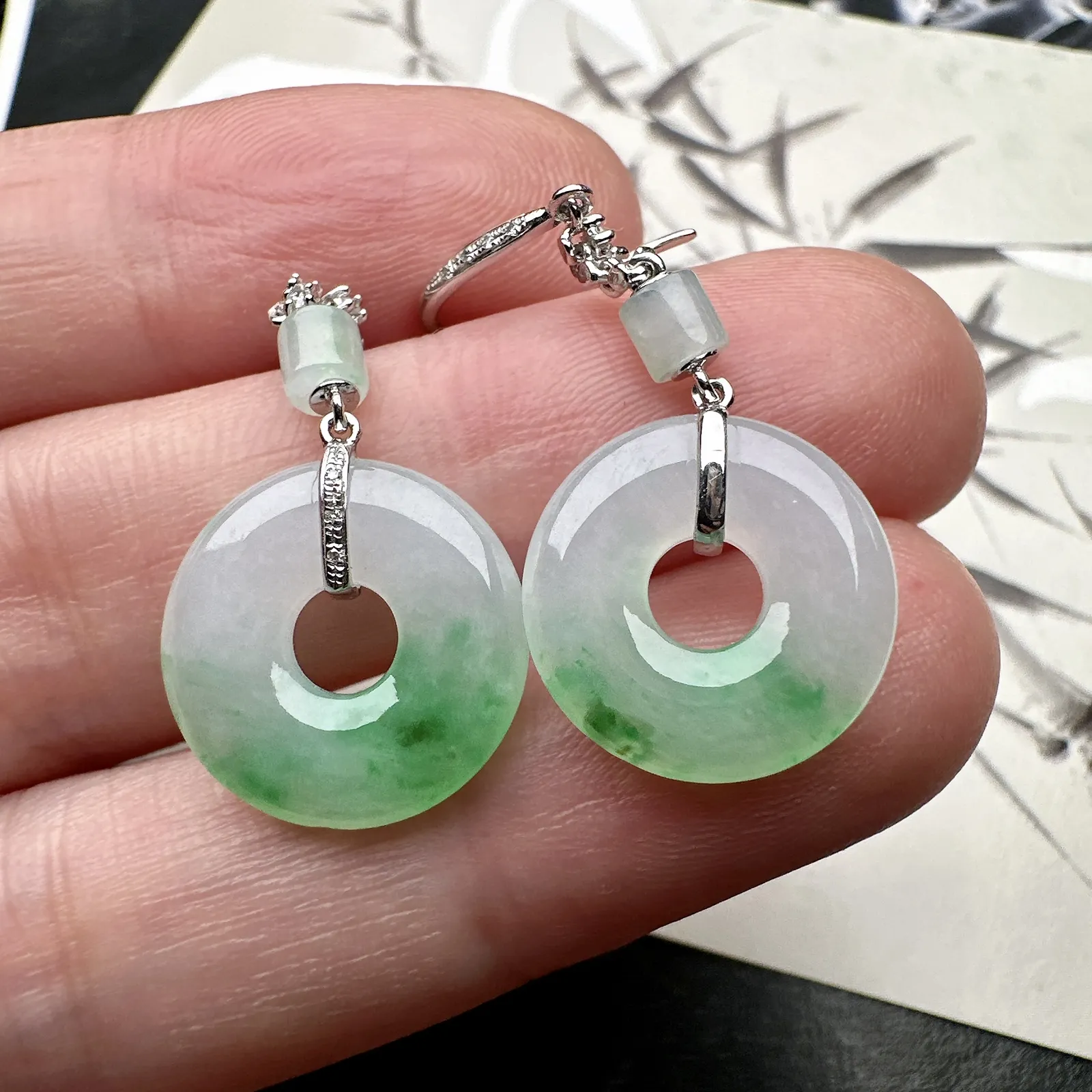 【冰种飘绿平安扣耳坠】质地细腻,种水上乘,18k金钻镶嵌,裸石尺寸14.6*3毫米