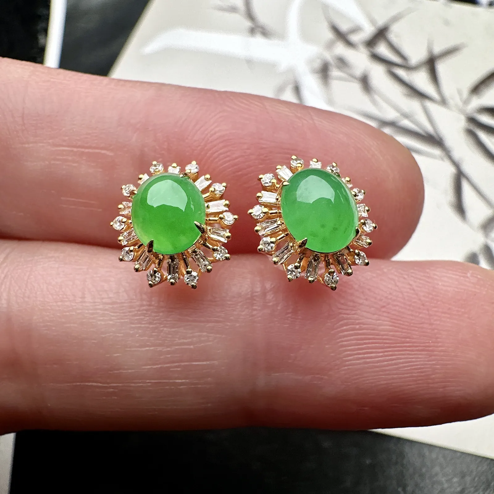 【冰种满绿蛋面耳钉】冰绿耳钉,饱满圆润,纯净冰透,上耳时尚大方。18k金钻镶嵌
