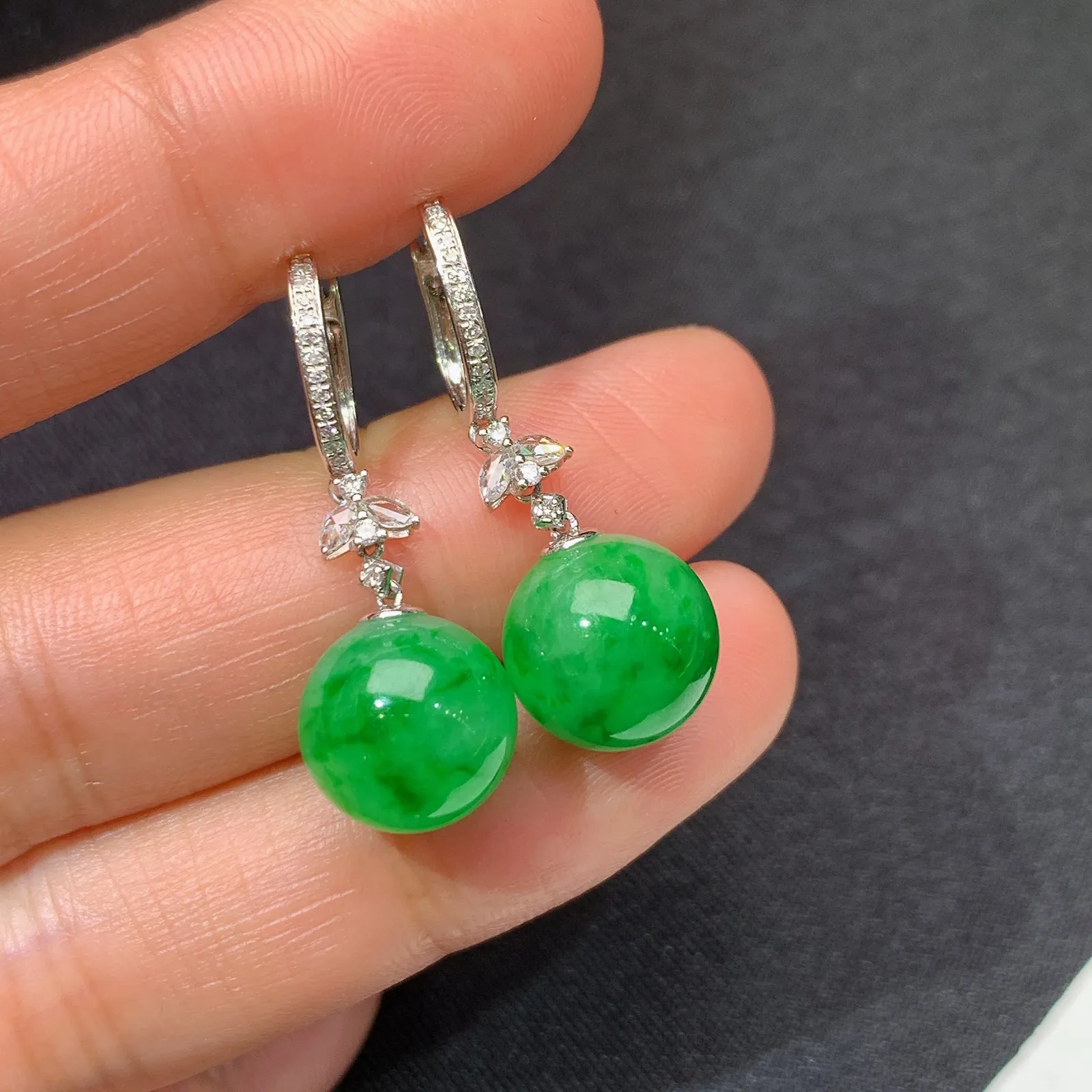 阳绿圆珠耳坠,18k金镶嵌,简约时尚,冰润色阳,种水足 直径10.5
