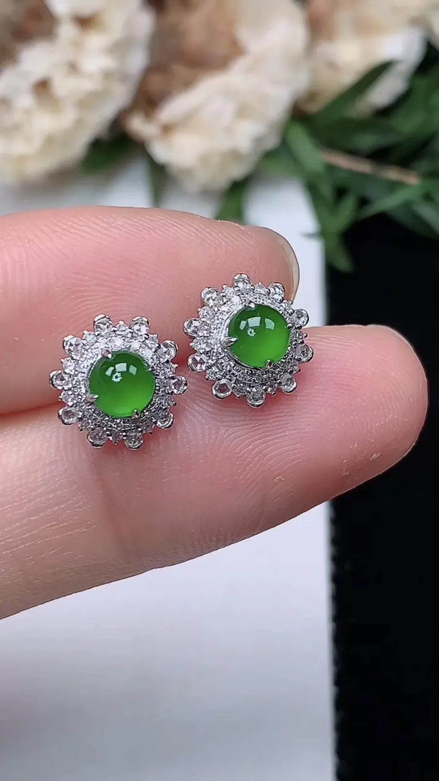 翡翠a货18k金冰种满绿蛋面耳钉,尺寸4,重量:1.40g