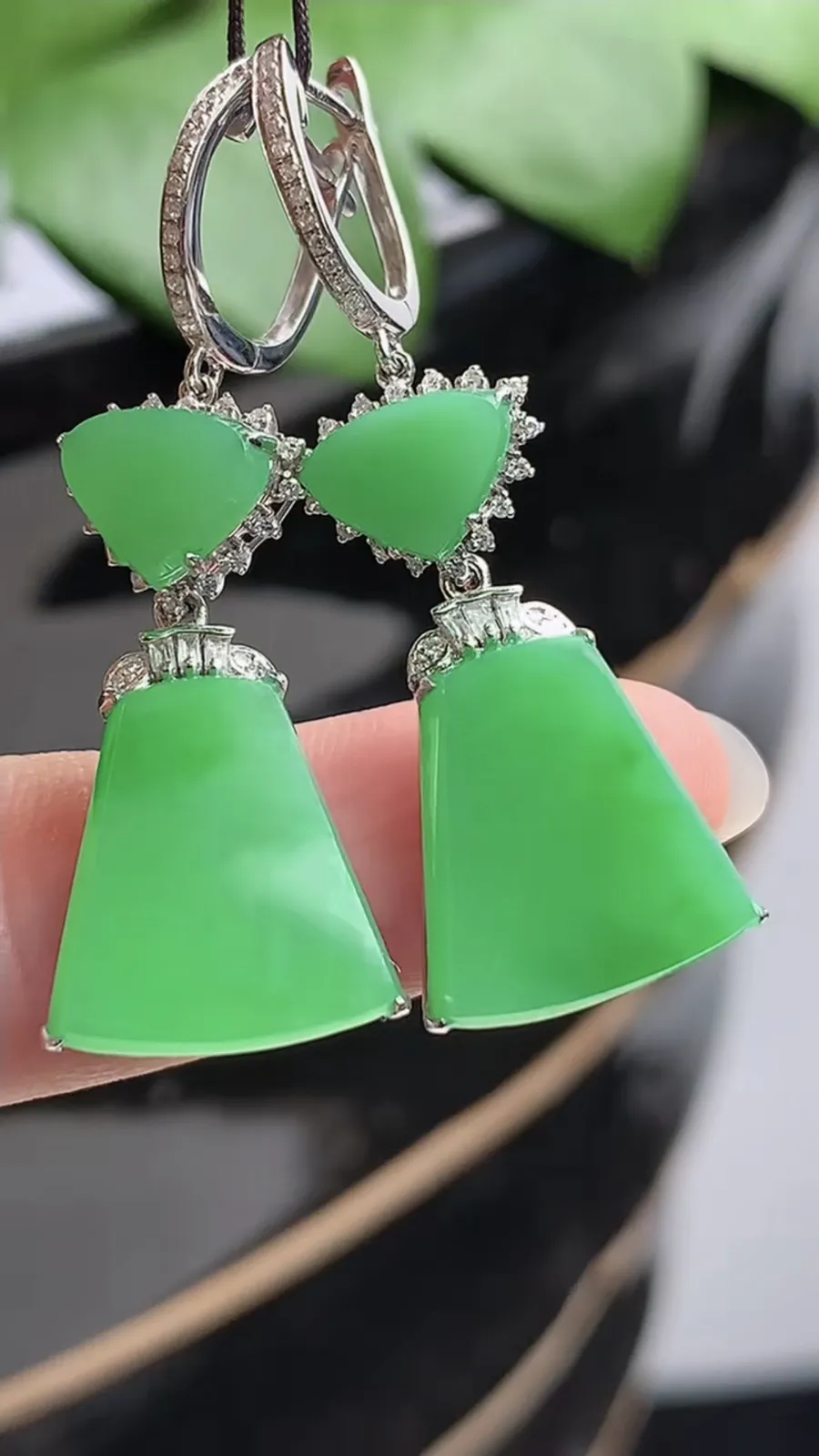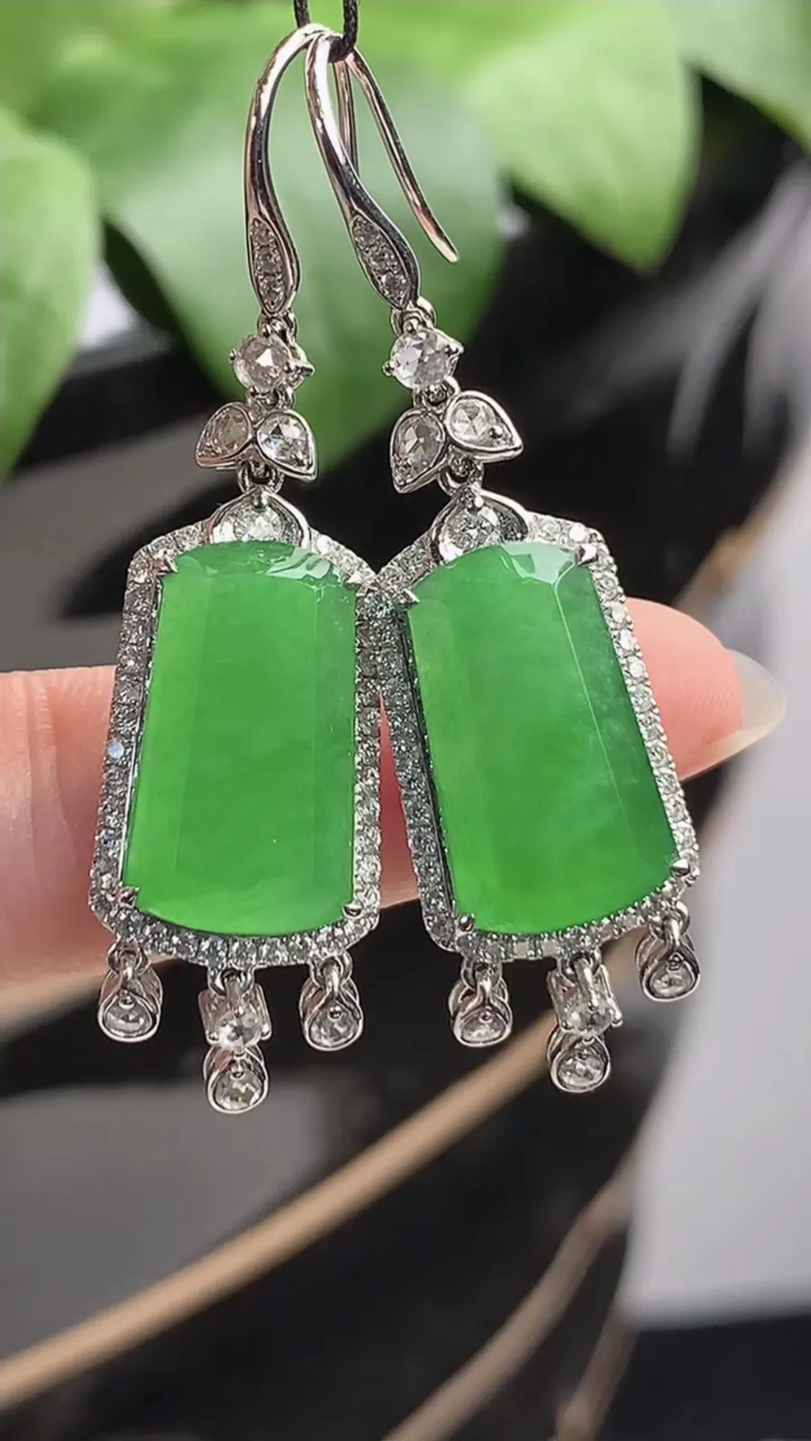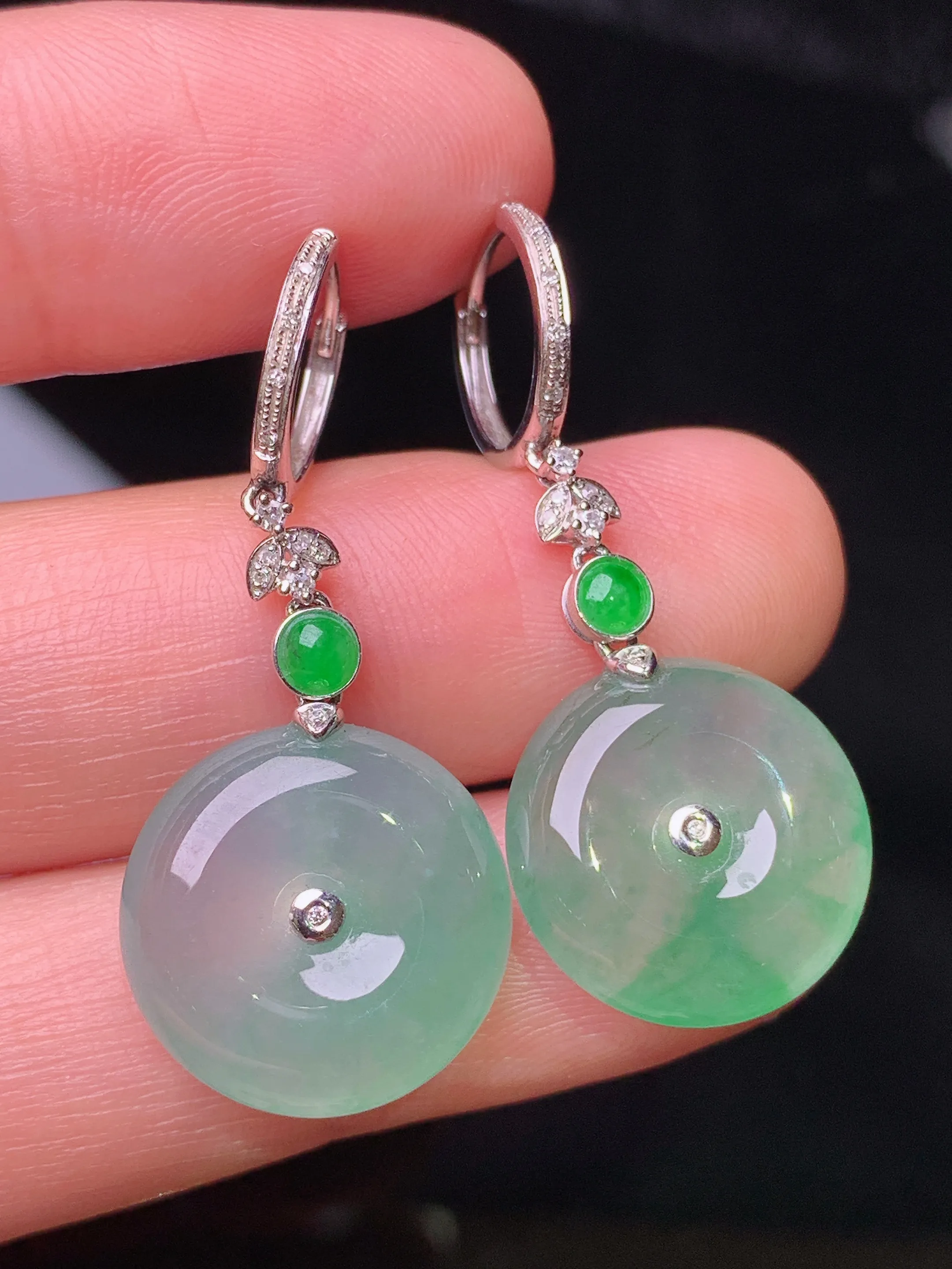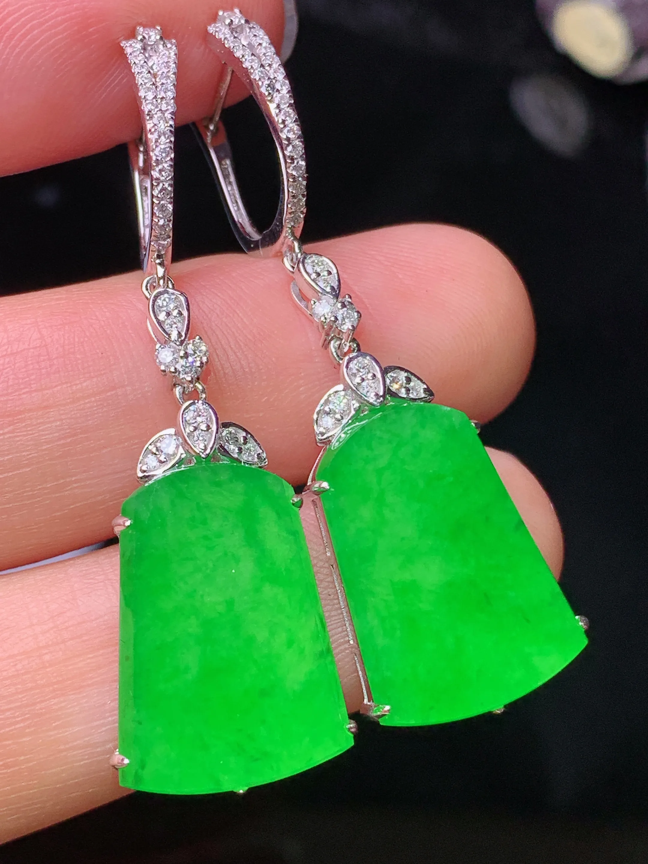 a货翡翠老坑冰种18K金伴钻镶嵌阳绿无事牌耳坠 尺寸15.7×8.8×6mm 重量9.24g 120