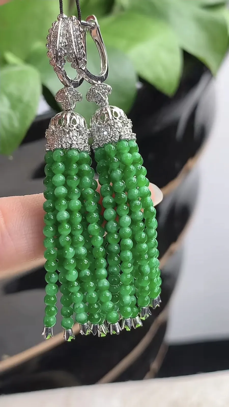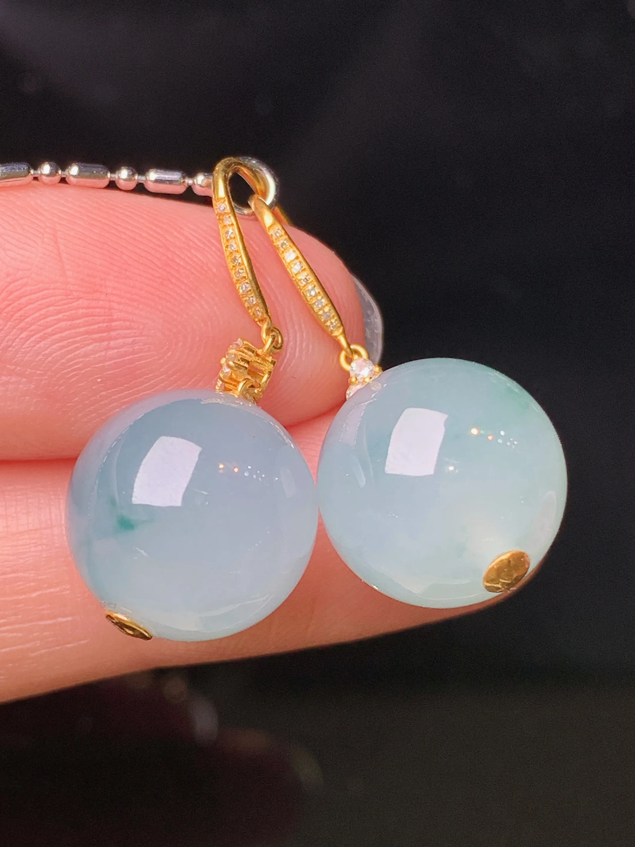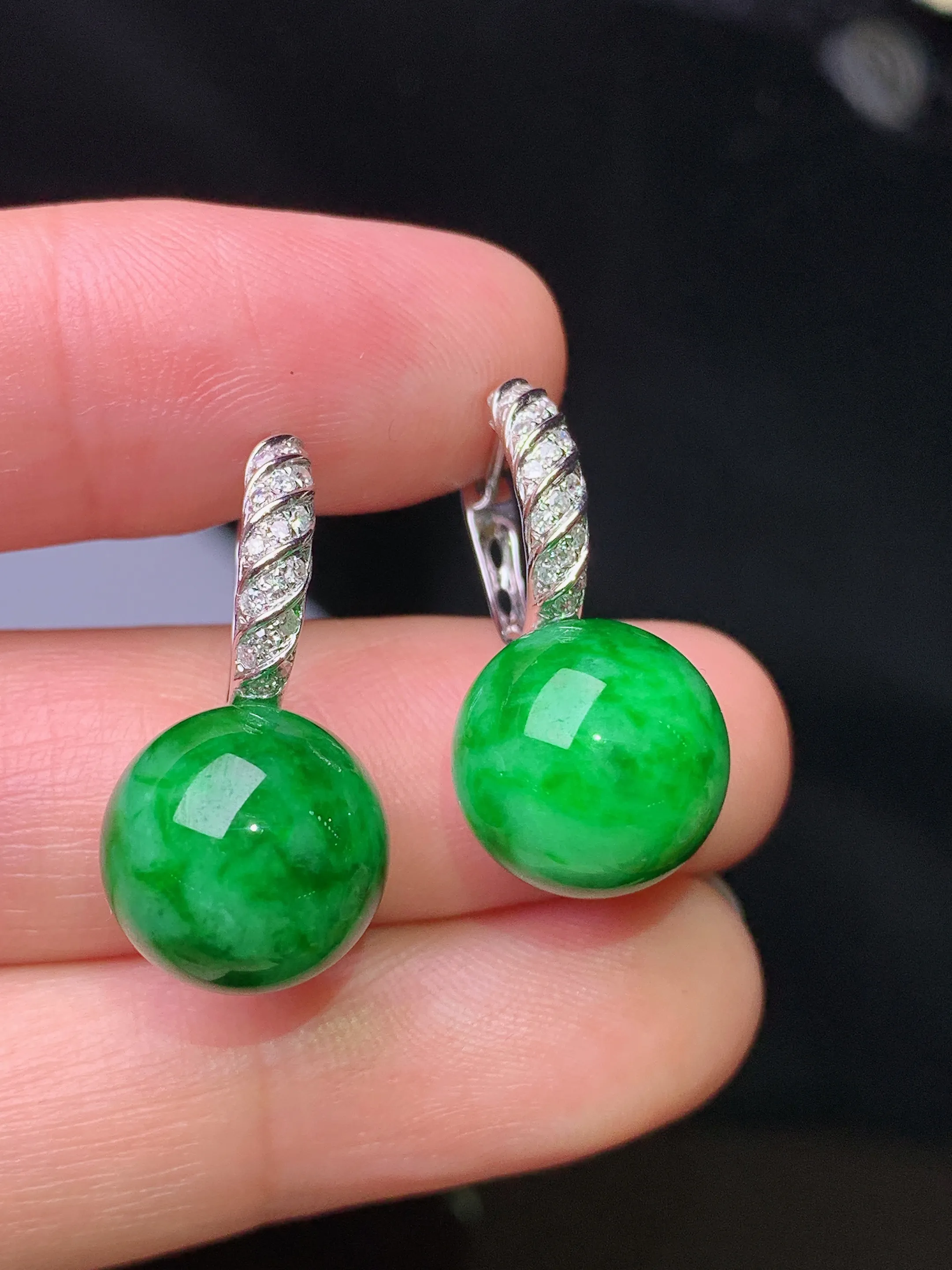 a货翡翠老坑冰种18K金伴钻镶嵌满绿圆珠小米珠耳坠 尺寸2mm 重量10.06g 1207