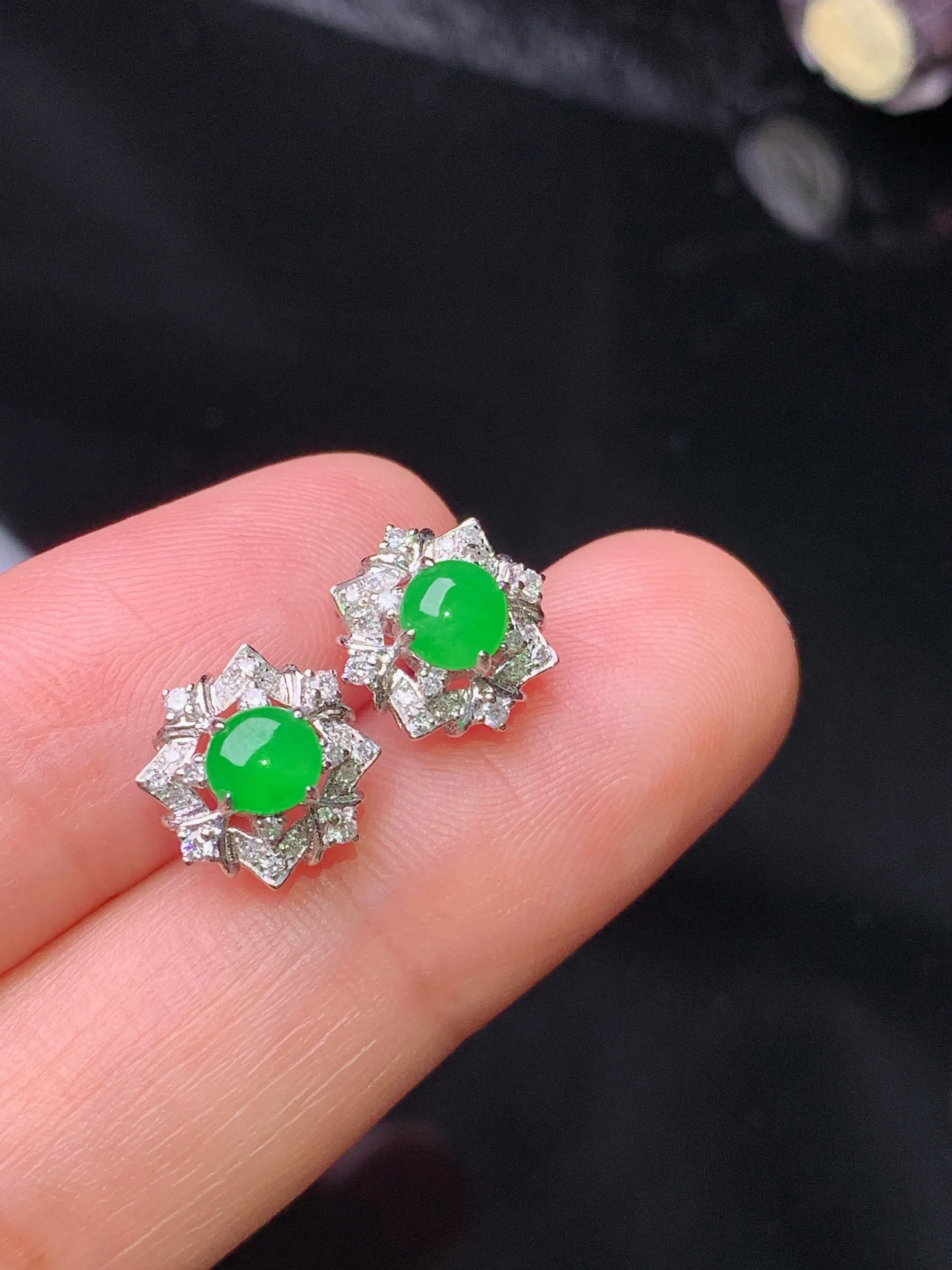 a货翡翠老坑冰种18K金伴钻镶嵌阳绿蛋面耳钉 尺寸8×7mm 重量2.33g 1206