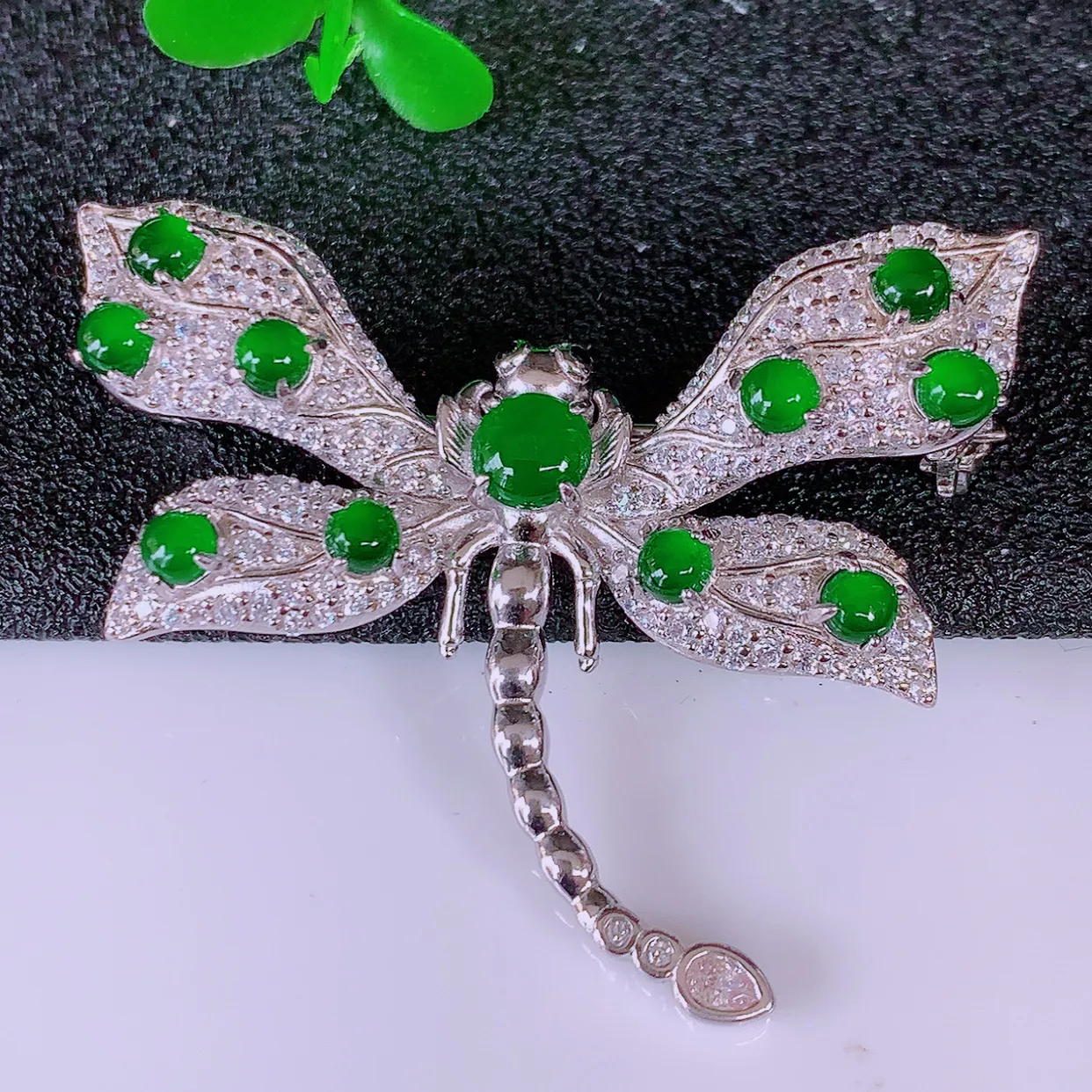 冰透满绿翡翠925银镶嵌蜻蜓胸针,自然光实拍,翠色灵动,颜色漂亮,种老水足,品相佳,佩戴佳品!#98