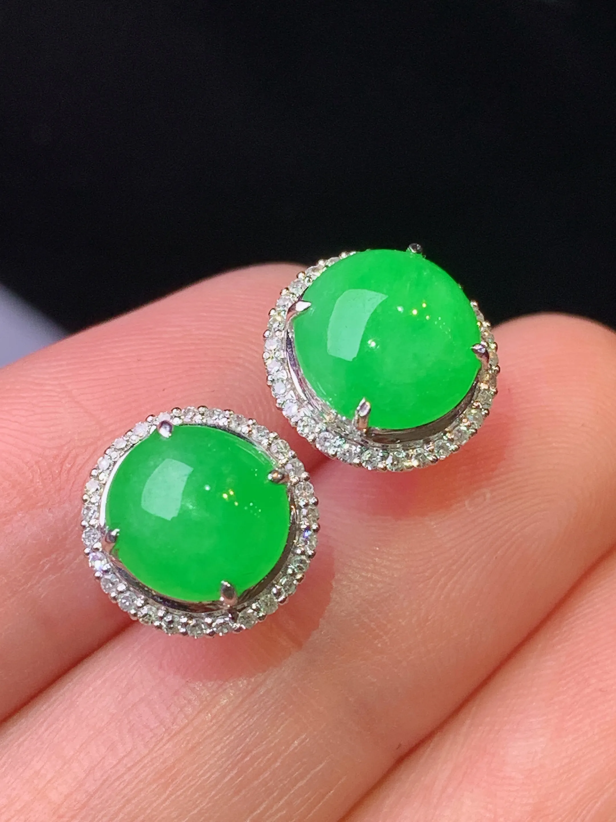 18k金钻镶嵌满绿蛋面耳钉 玉质细腻 色泽清新艳丽 整体尺寸10.8*10.3*7.2