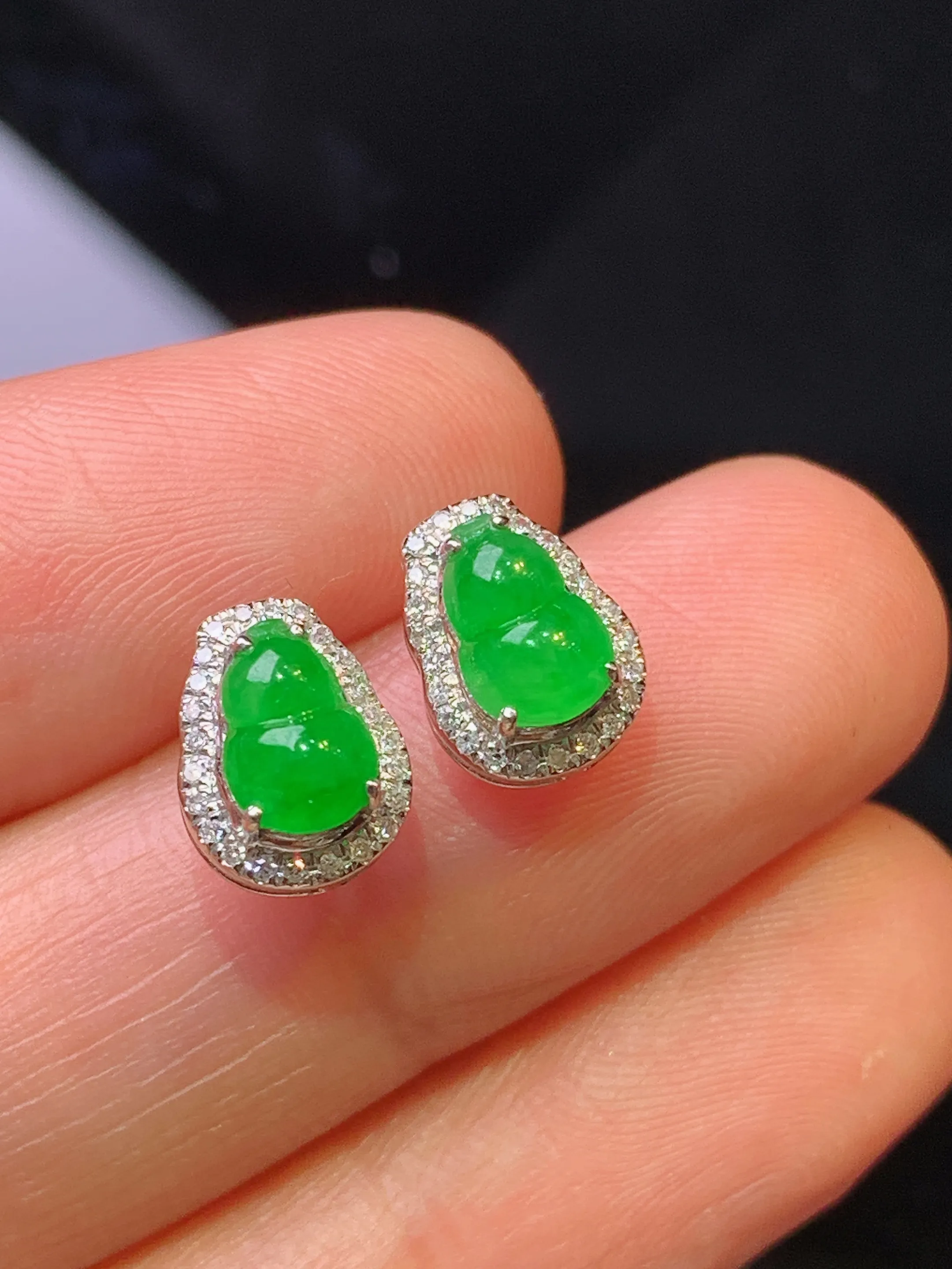 18k金钻镶嵌葫芦耳钉 玉质细腻 色泽艳丽清新 整体尺寸9.3*7.2*5.3