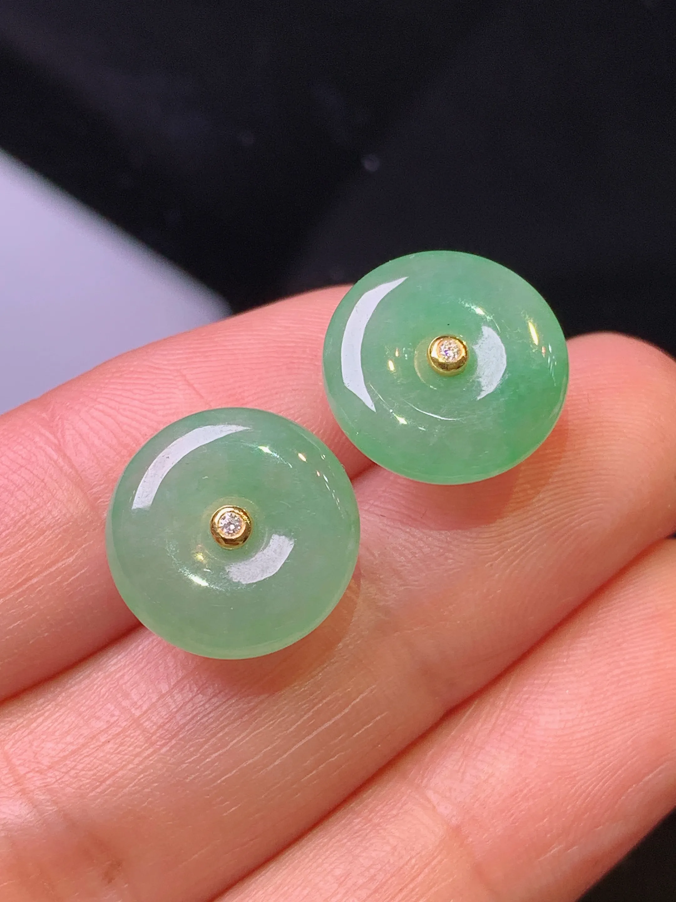 18k金镶嵌浅绿平安扣耳钉 玉质细腻 色泽艳丽清新 整体尺寸13*4