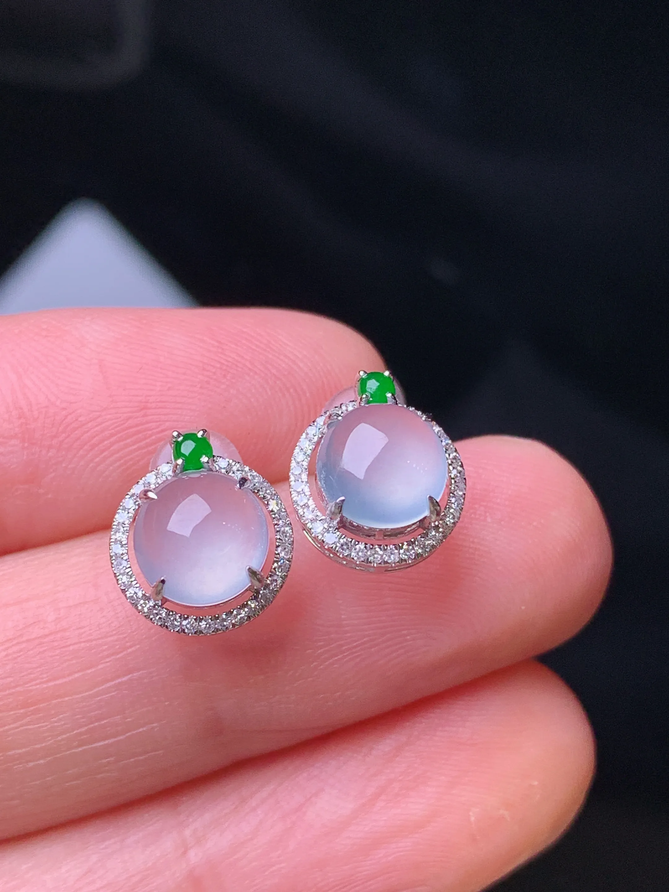 18k金钻镶嵌冰种蛋面耳钉 玉质细腻 色泽艳丽清新 整体尺寸 10.5*9*5.8