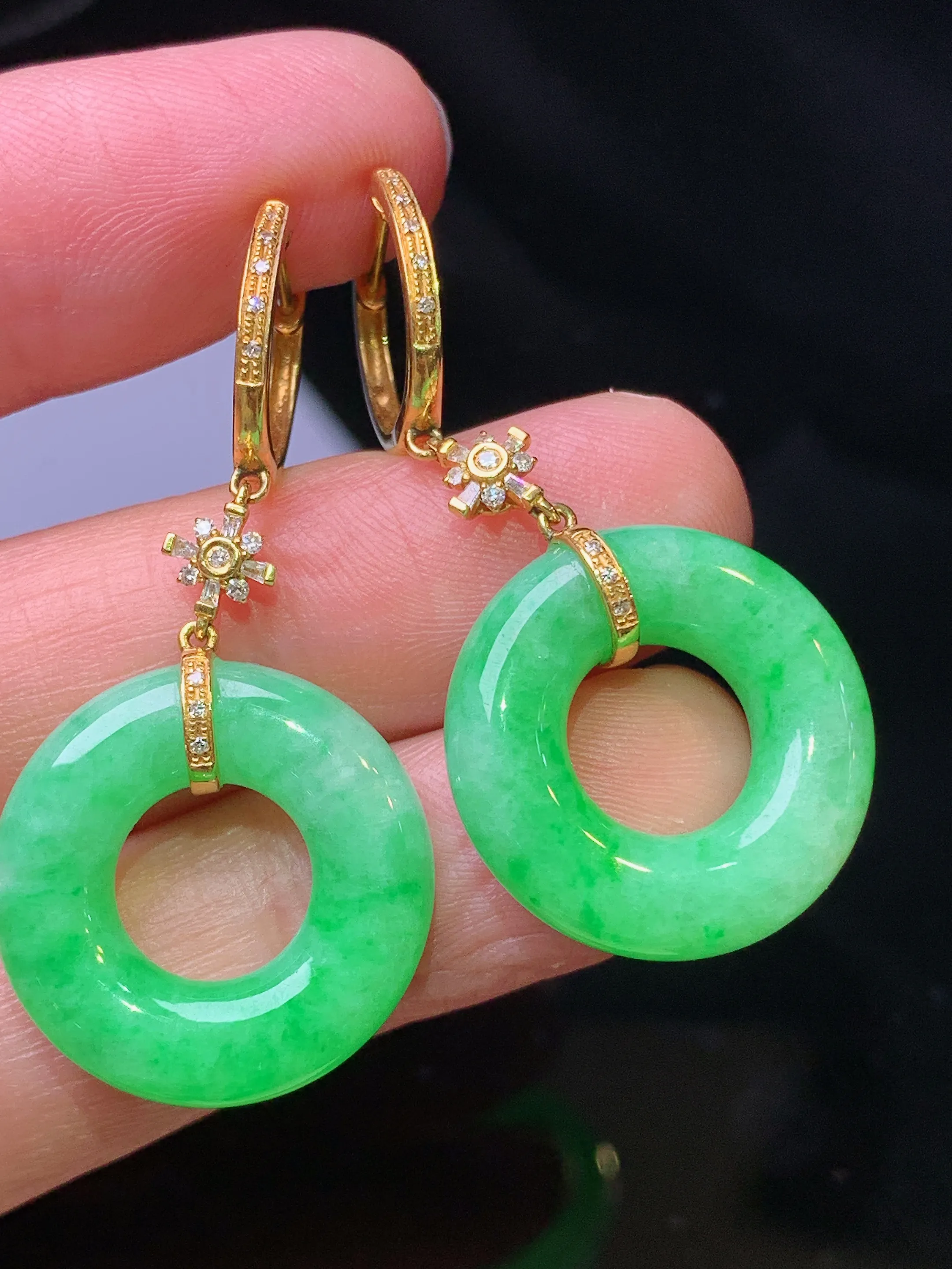 18k金钻镶嵌翠绿平安环耳坠 玉质细腻 色泽艳丽清新 整体尺寸 39.8*19.5*5