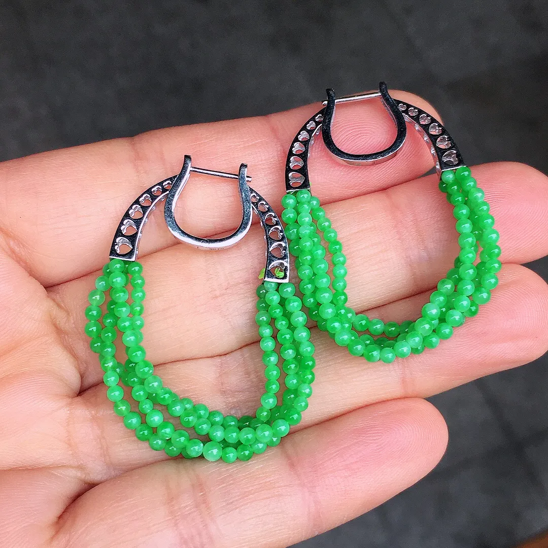 阳绿珠子耳坠,色泽均匀艳丽,玉质细腻,荧光感超 强,饱满圆润,尽显优雅气质,18k 金豪华镶嵌