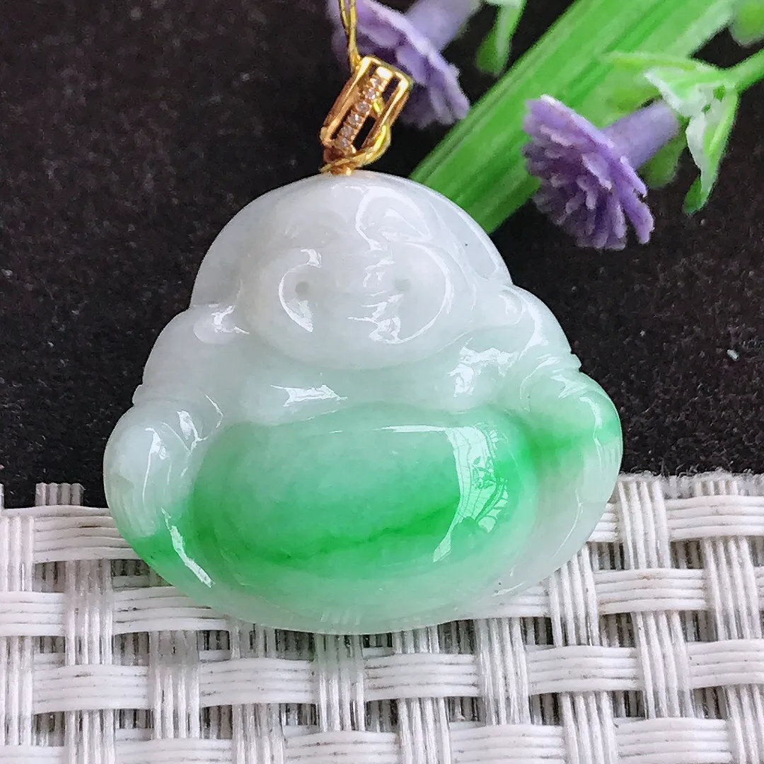 天然a货翡翠24/26.7/5.8老坑18k金镶嵌温润飘阳绿佛公吊坠翡翠玉坠挂件百搭