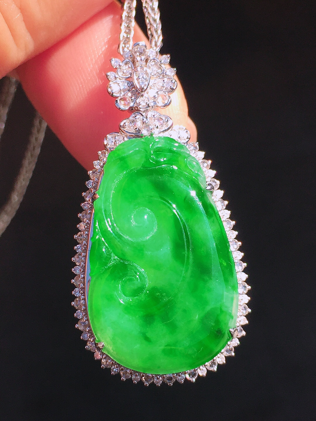 阳绿如意吊坠,色泽均匀艳丽,玉质细腻,荧光感超 强,饱满圆润,尽显优雅气质,18k 金豪华镶嵌