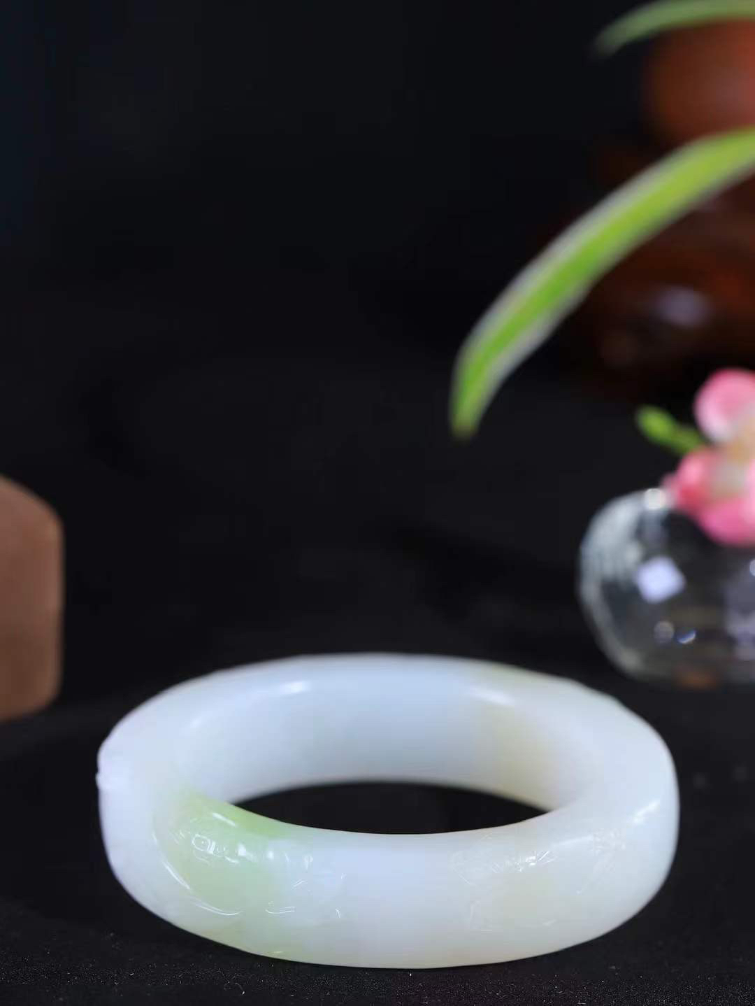 【连年有余.手镯】 收藏级️和田玉白玉带翠连年有余手镯 玉质温润细腻 油性十足 精雕鱼儿,鱼鳞精