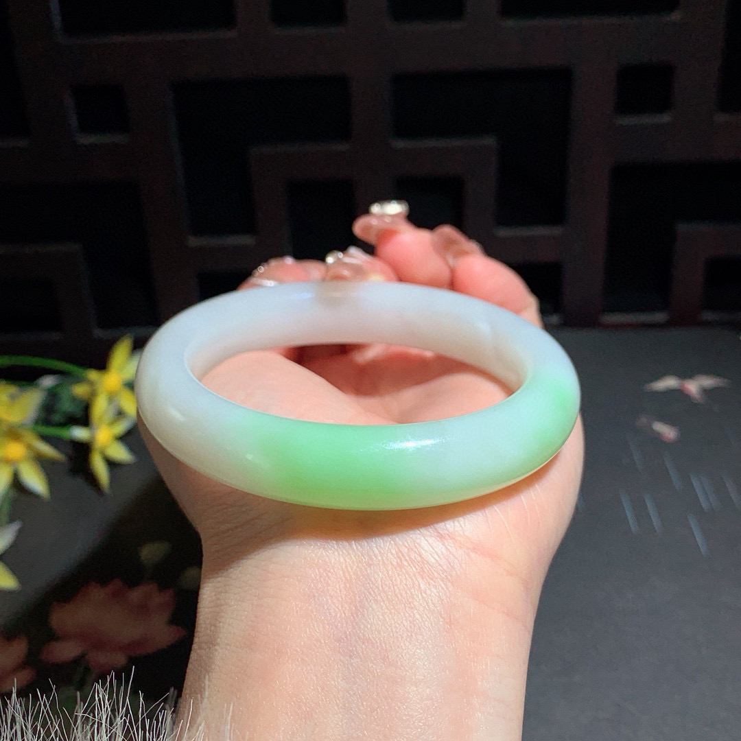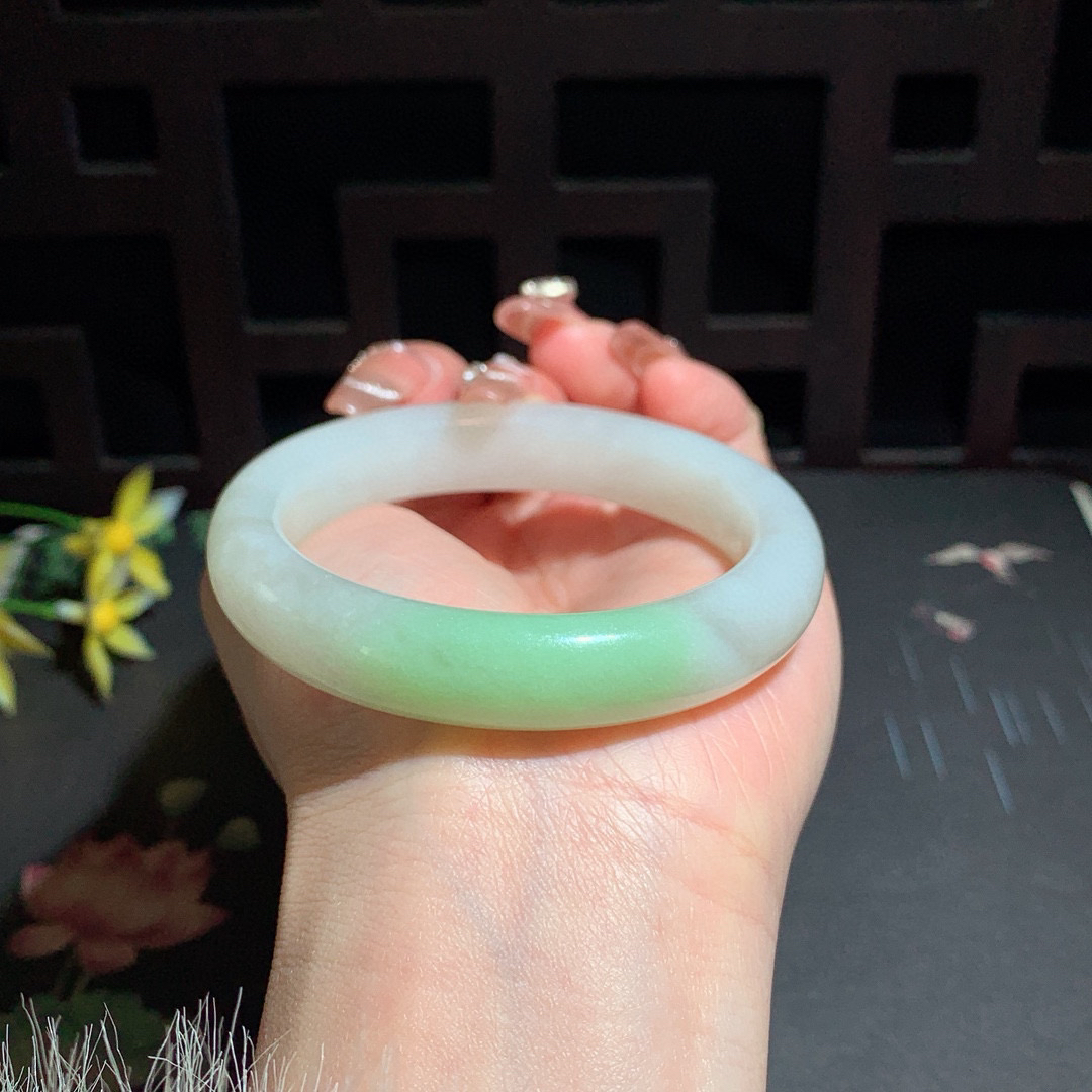 A货天然翡翠冰糯种黄飘花手镯59圈重量50.66 4月11日