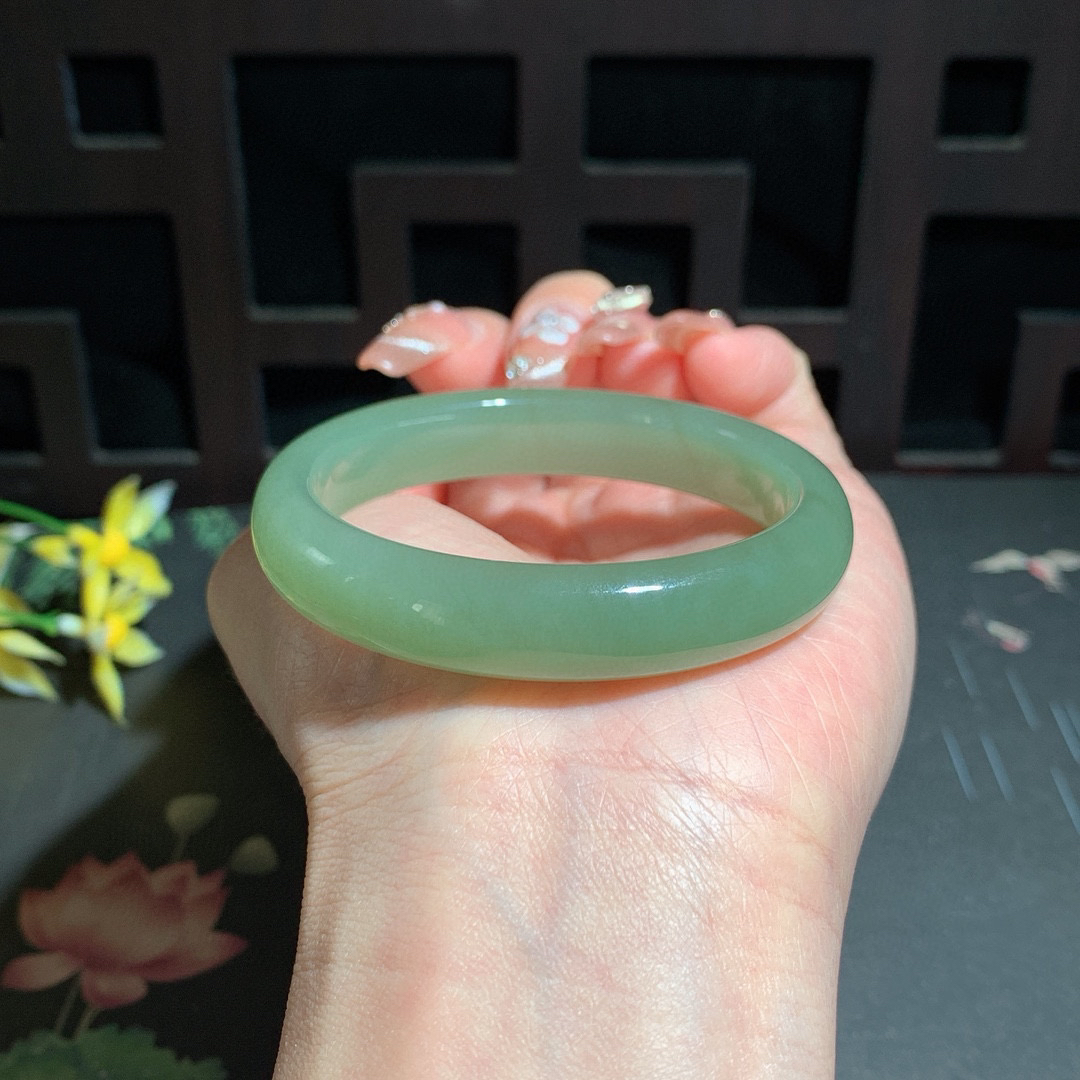 【翡翠名称】老种飘阳绿53.5正圈口手镯 【翡翠尺寸】53.5/12.3/7.4mm适合52.5-5