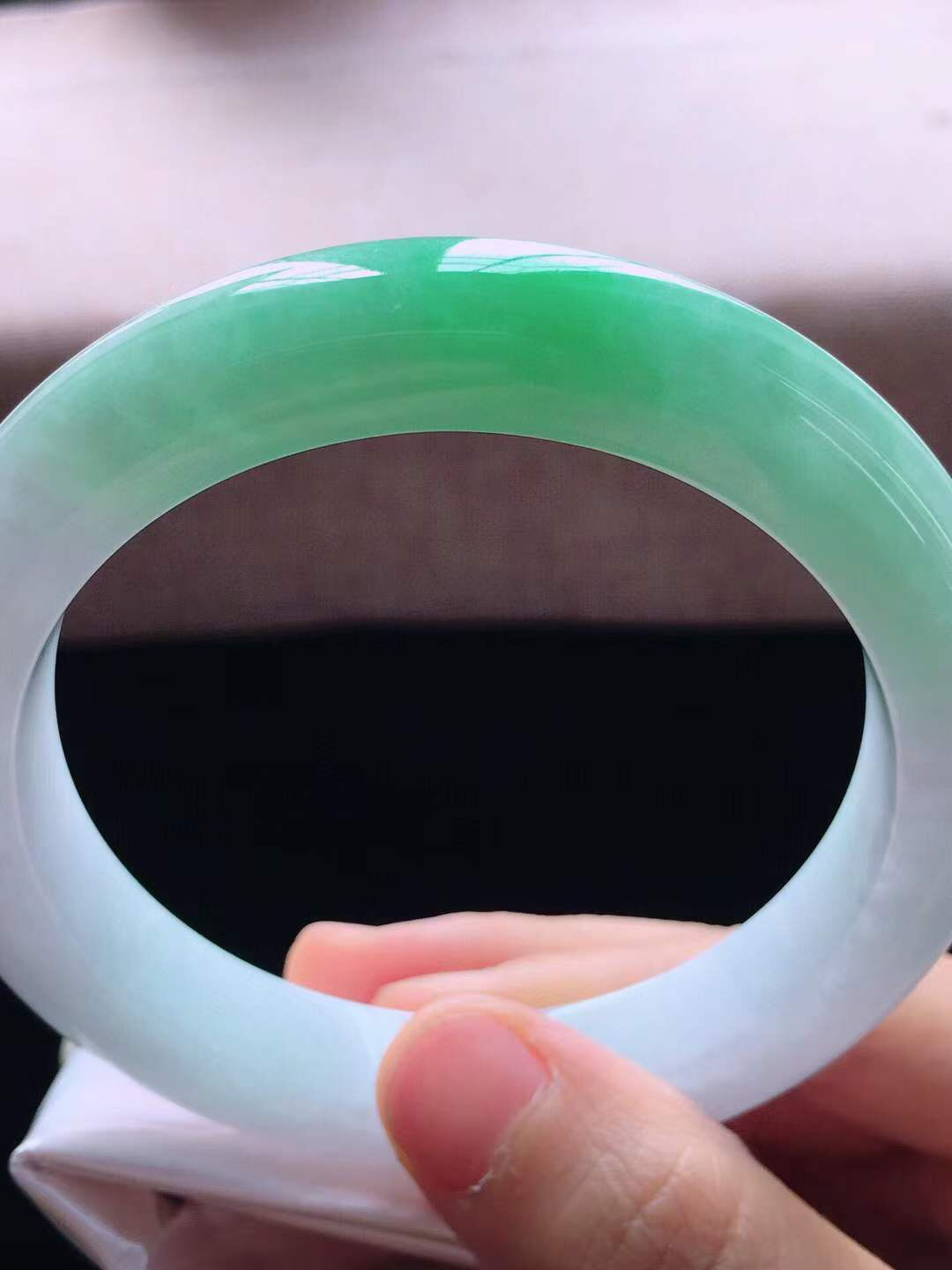 【翡翠名称】老坑种飘阳绿62大圈口手镯 【翡翠尺寸】62*12.2*9.6mm适合61-63正圈口佩