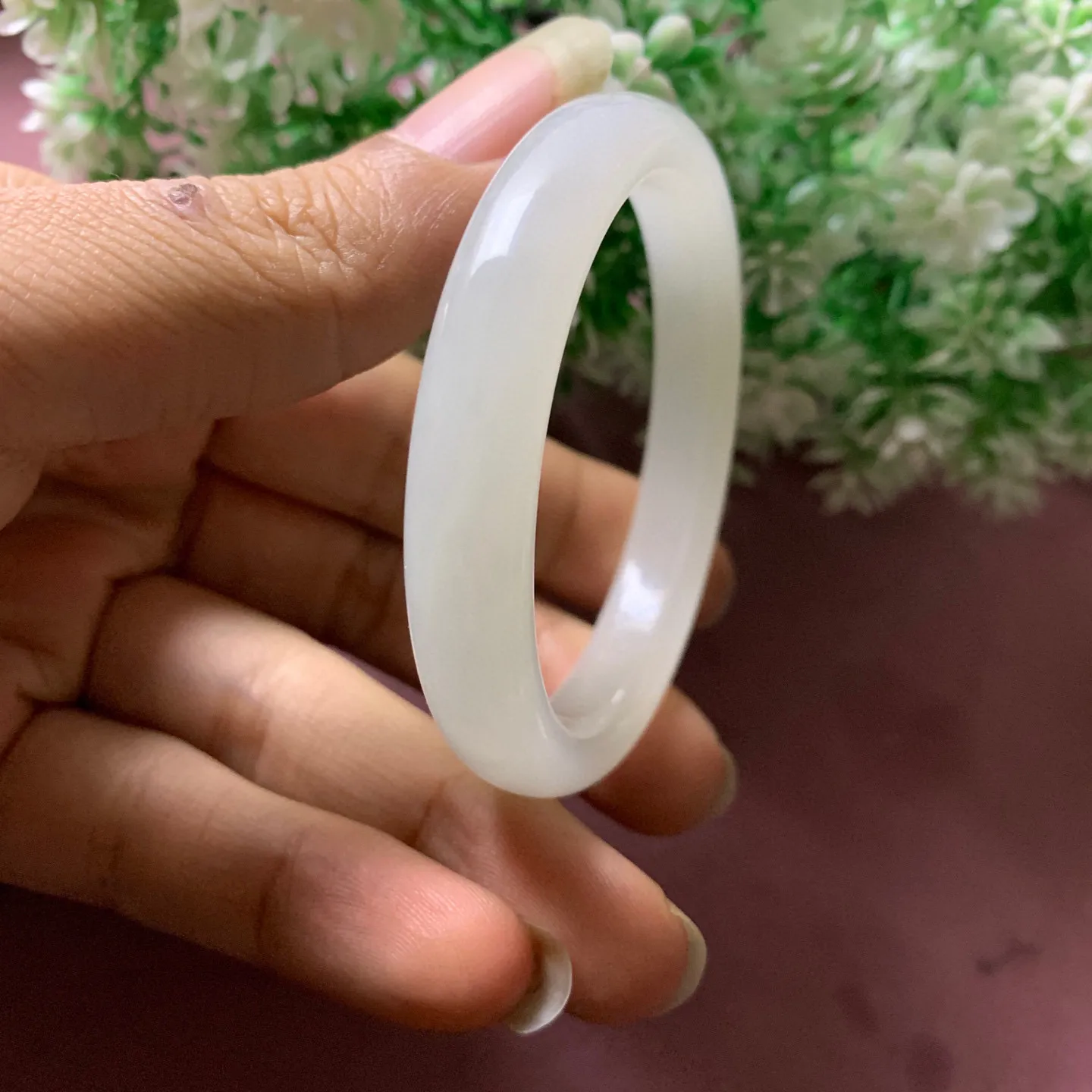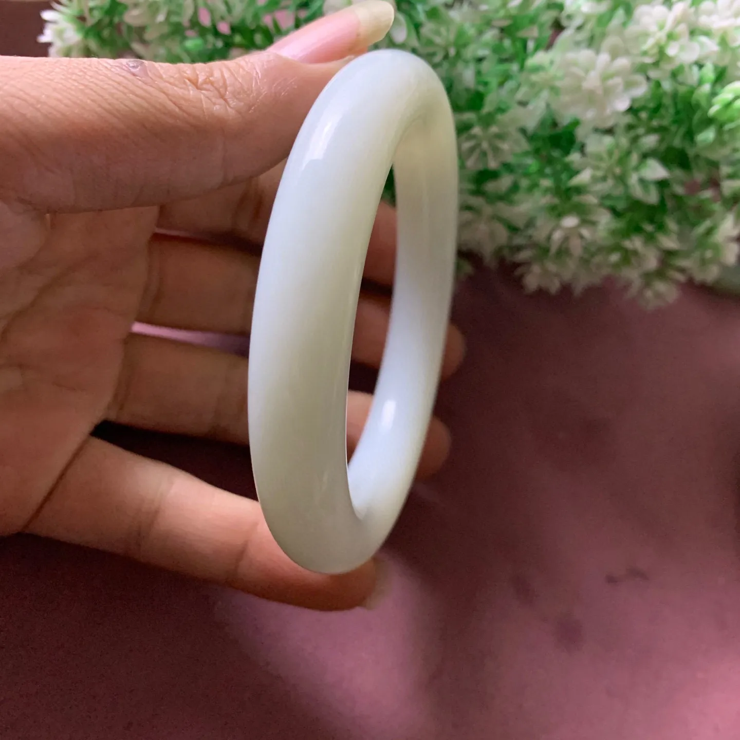和田玉55.5圈口紫罗兰色手镯!圈口55.5宽12.5玉质细腻油润 底色纯净 无裂无杂 脂粉好,品质