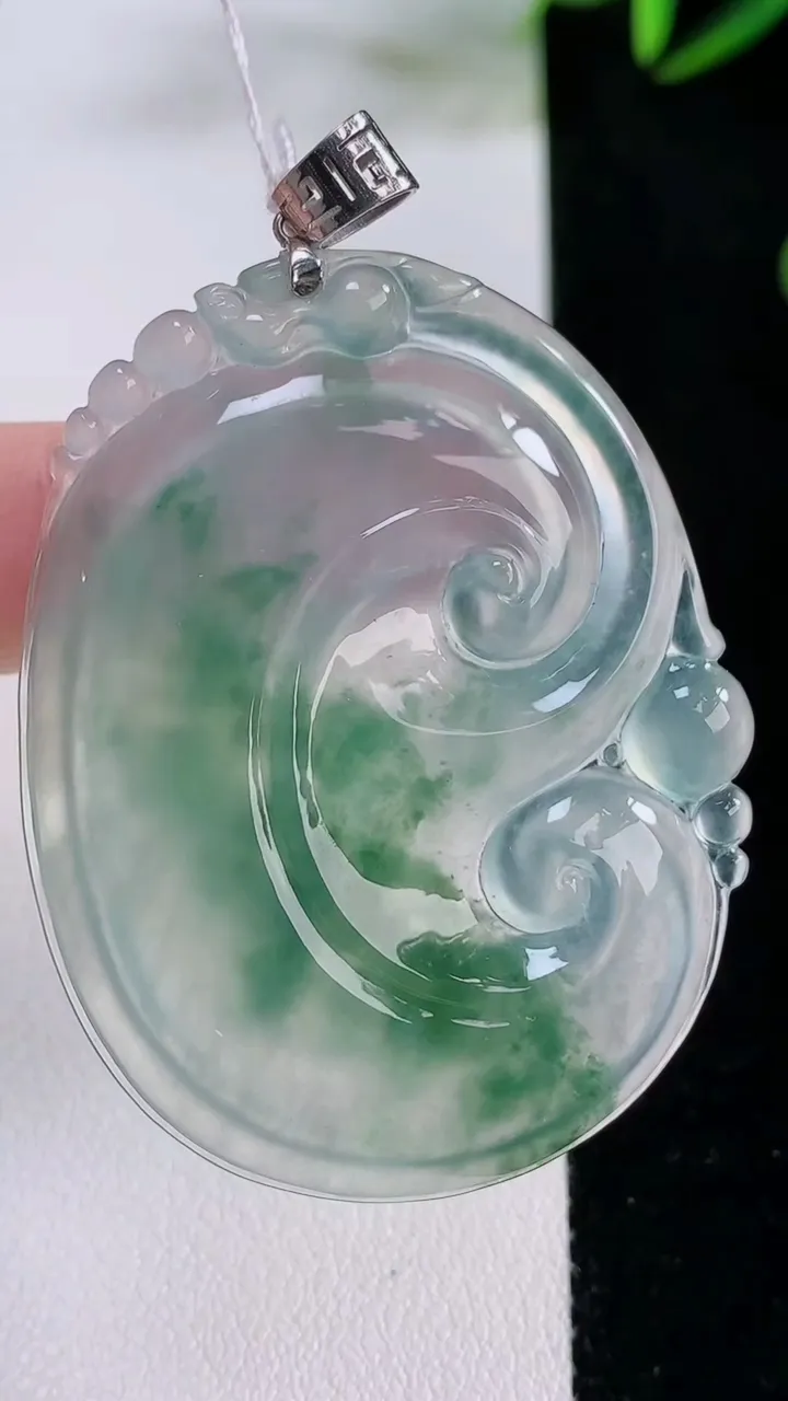 天然A货翡翠种飘花如意吊坠,尺寸49-37.8-4.4,重量:15.68g 11月24日