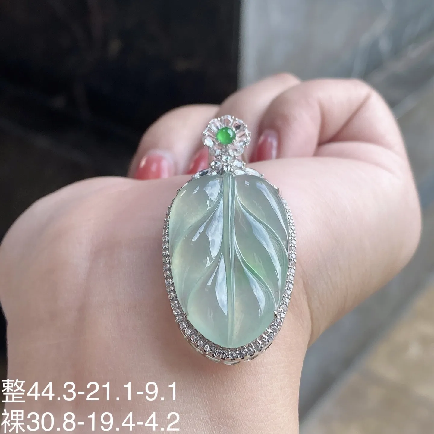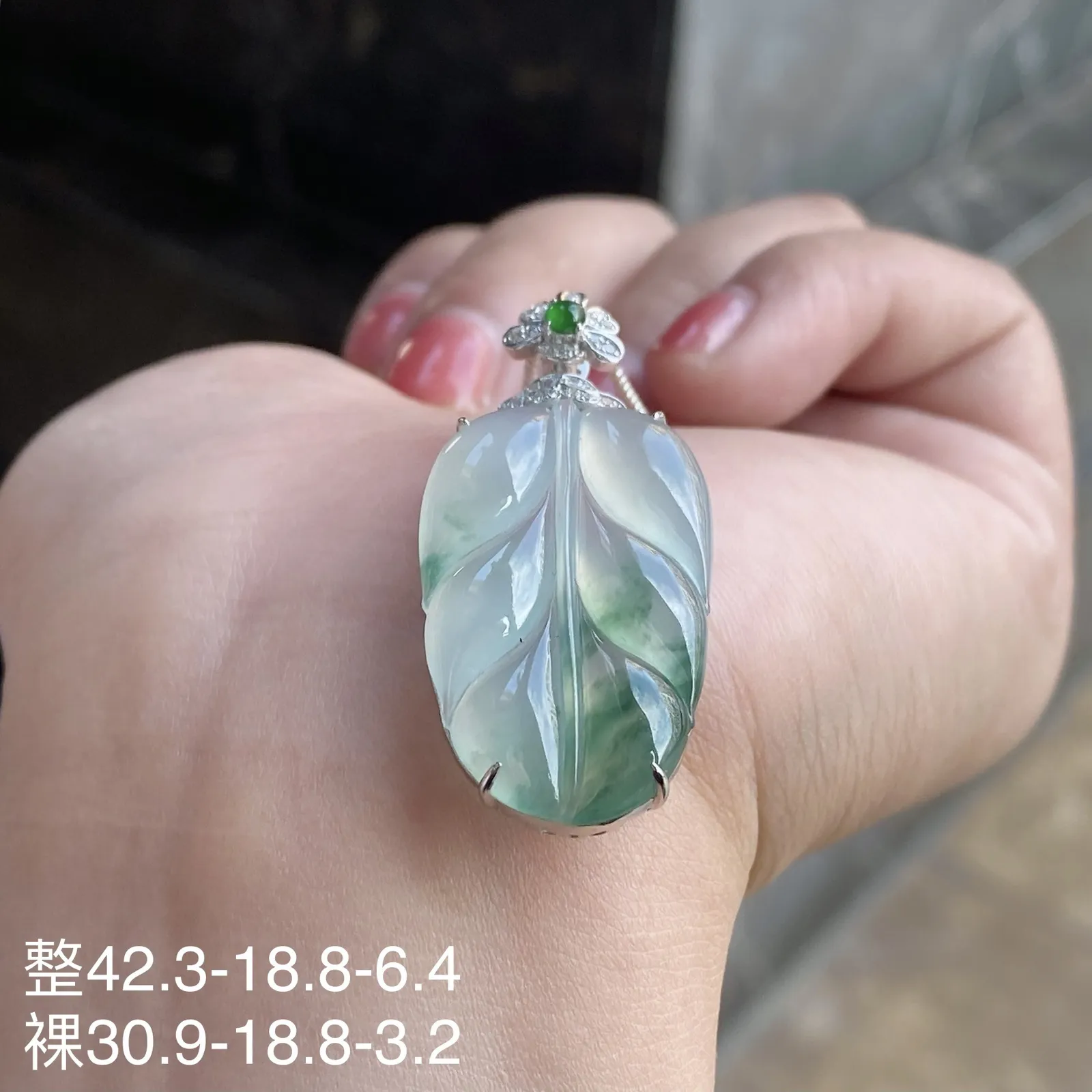 冰种飘花叶子吊坠 尺寸42.3-18.8-6.4毫米