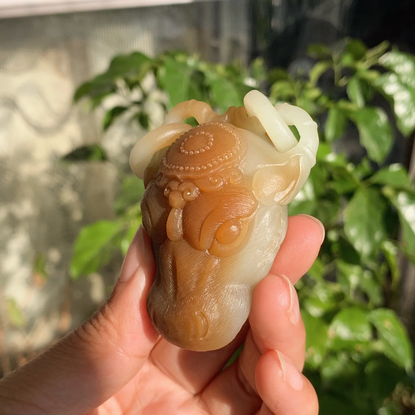 新疆且末糖扭转乾坤牛头挂件。尺寸60/43/27重91克。玉质细腻油润。手推出油。品相大气。lt25