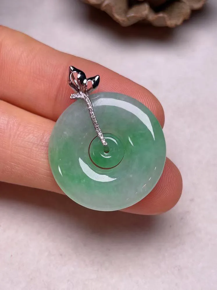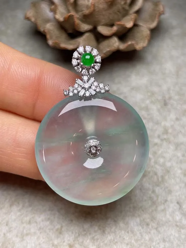 冰糯种飘绿平安扣吊坠、真金真钻镶嵌,种水好,玉质细腻 .裸石尺寸 23.3*3.9