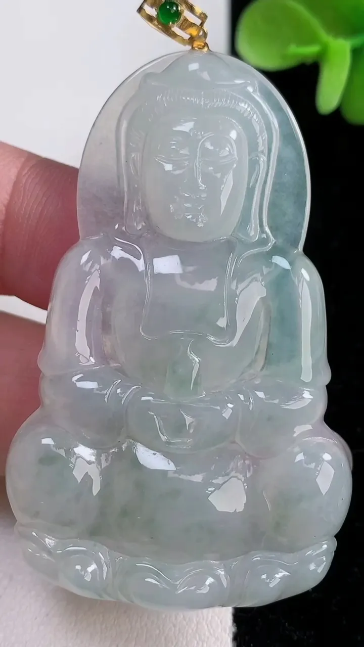 天然A货翡翠种飘花观音菩萨吊坠,尺寸59.4-36.8-4,重量:17.54g 12月14日