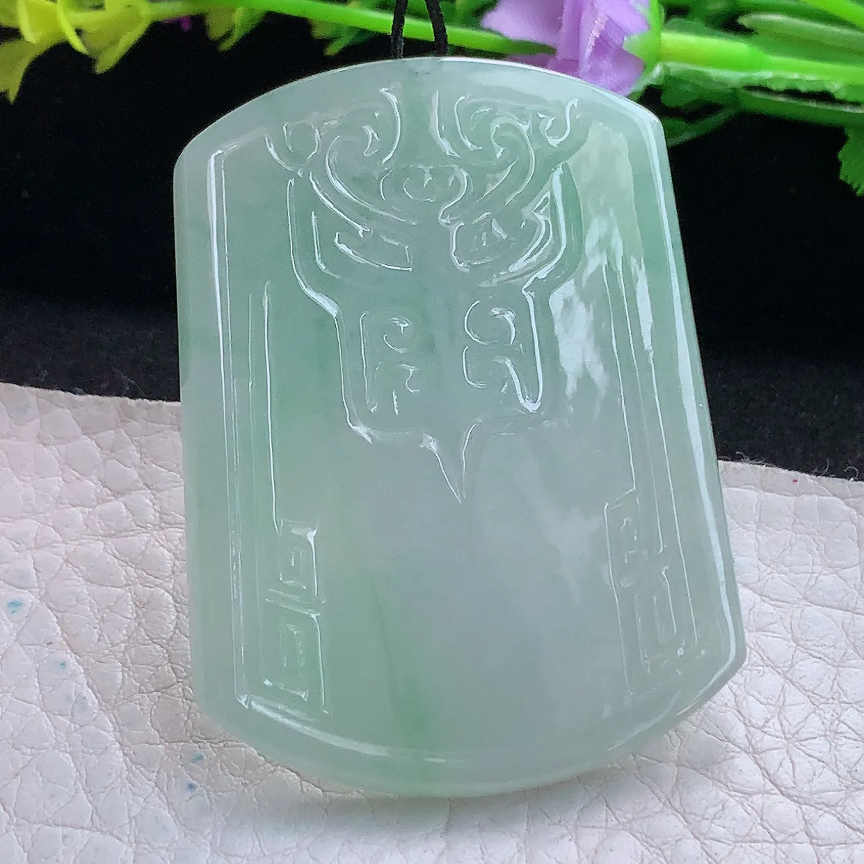 飘绿无事牌吊坠 玉质细腻 色泽艳丽清新 整体尺寸50.5*32.7*5