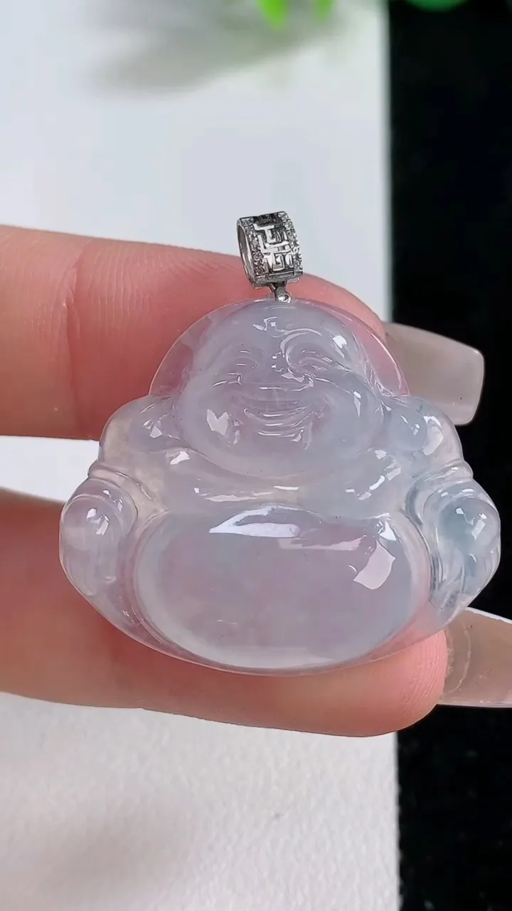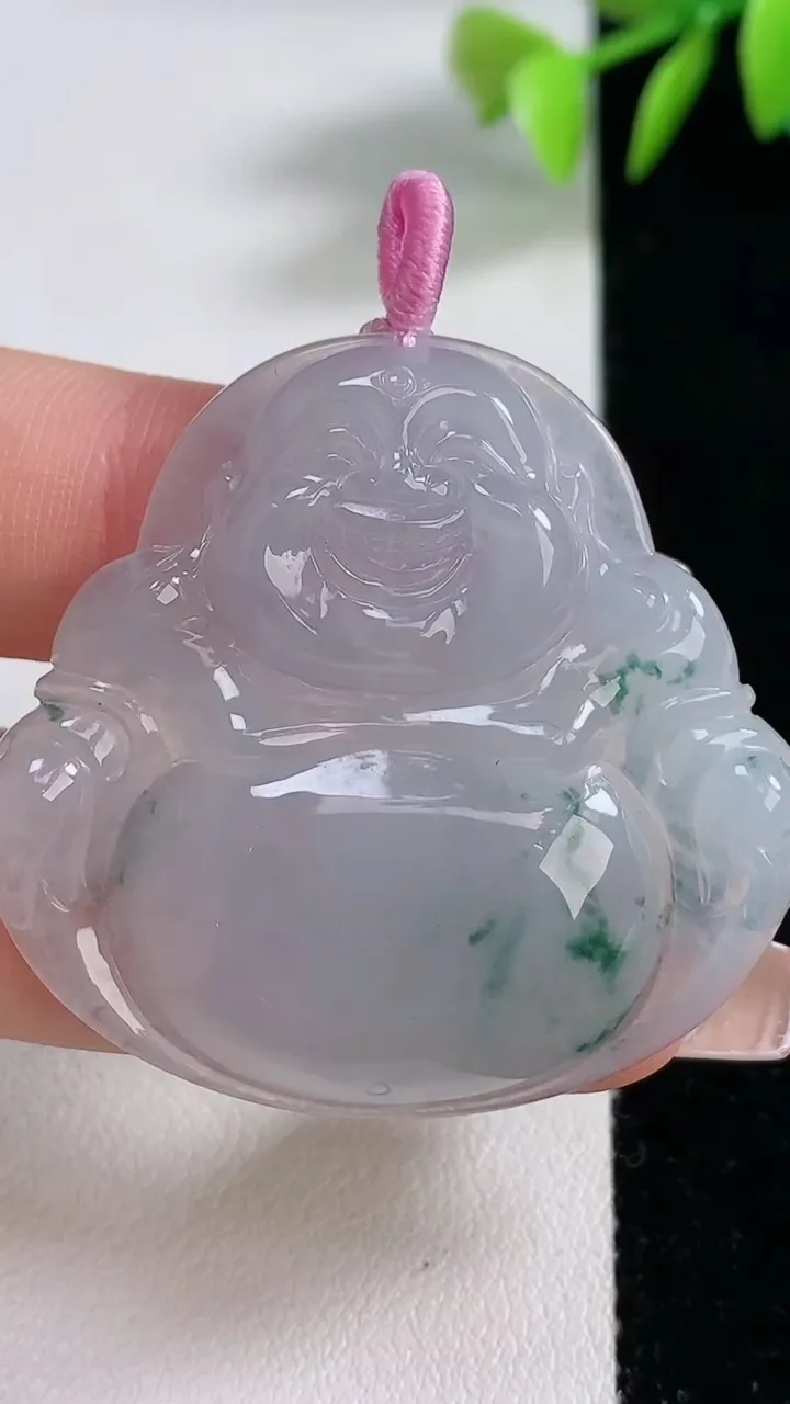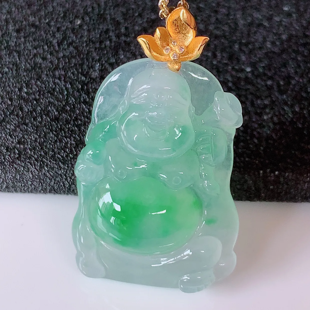 18K金镶嵌冰种飘绿翡翠逍遥布袋佛吊坠, 代代有钱,水足丰盈,盈满欢喜,配戴送礼佳品!#1.9整体3