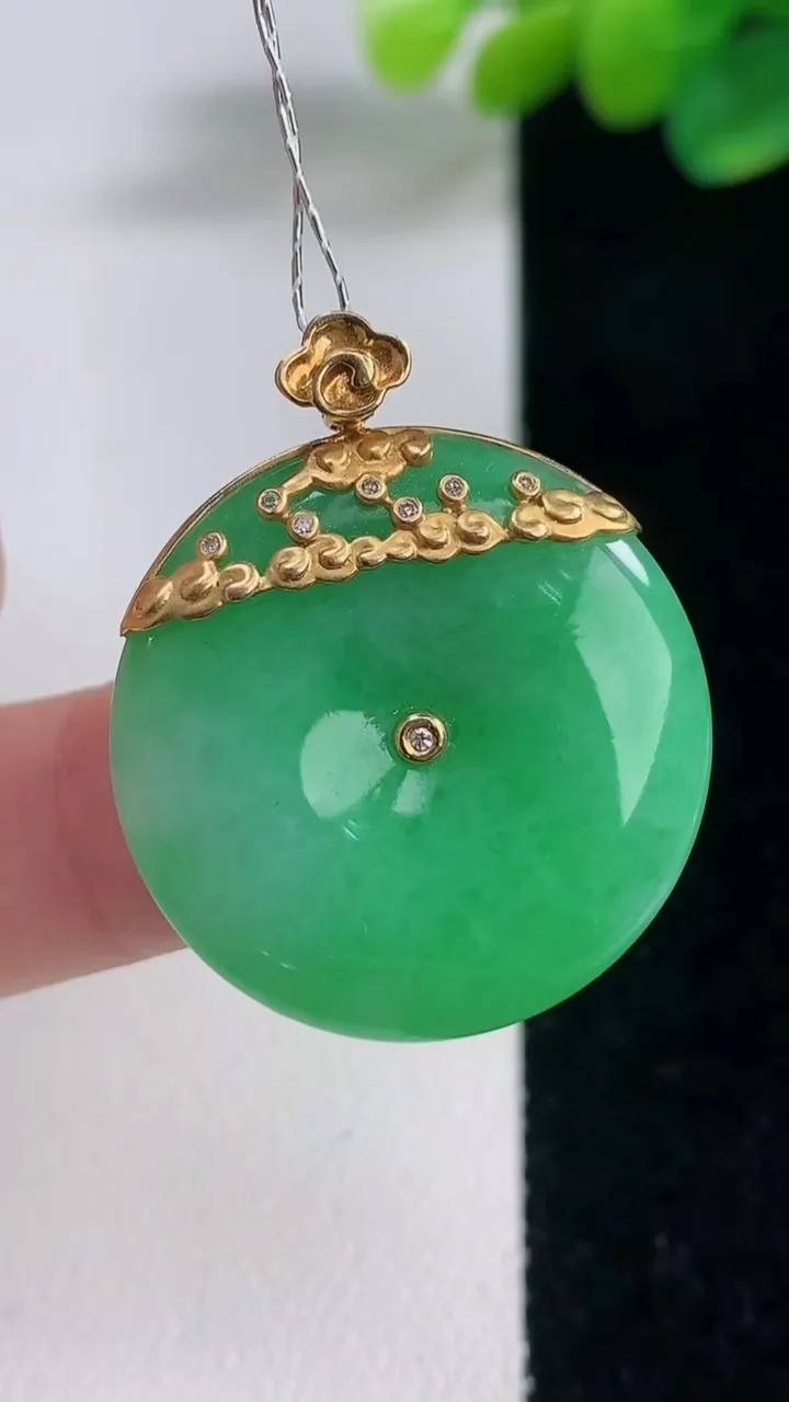 天然A货翡翠18K金飘花平安扣吊坠,尺寸31.6-5.6,重量:12.62g 12月13日
