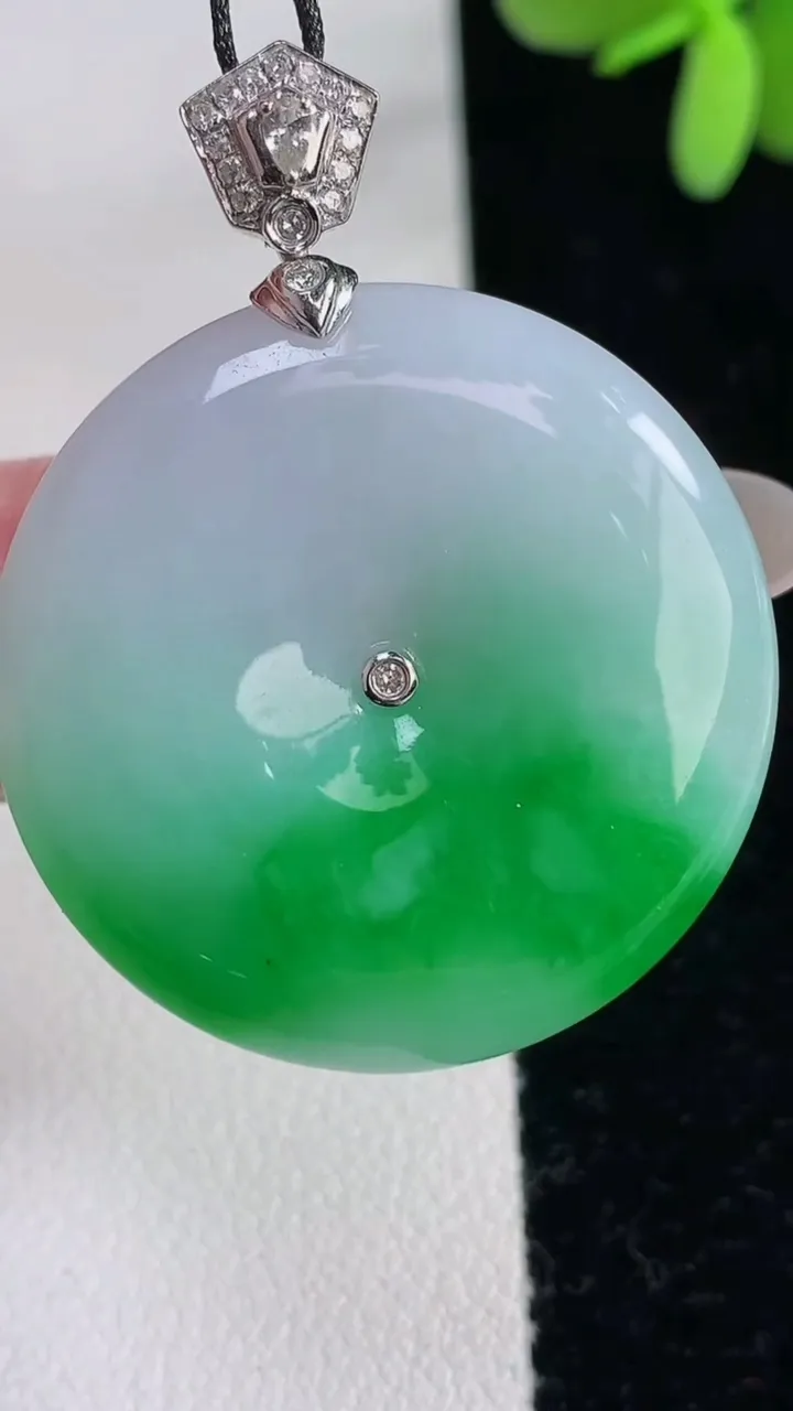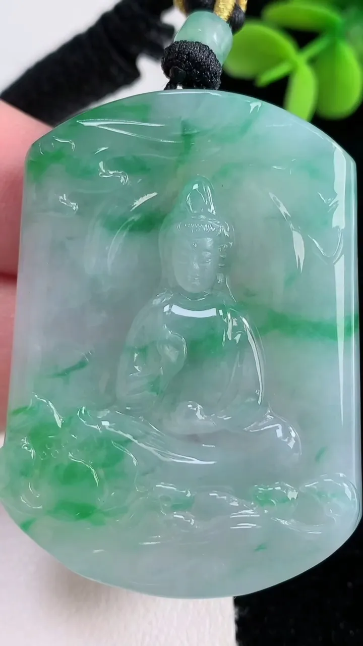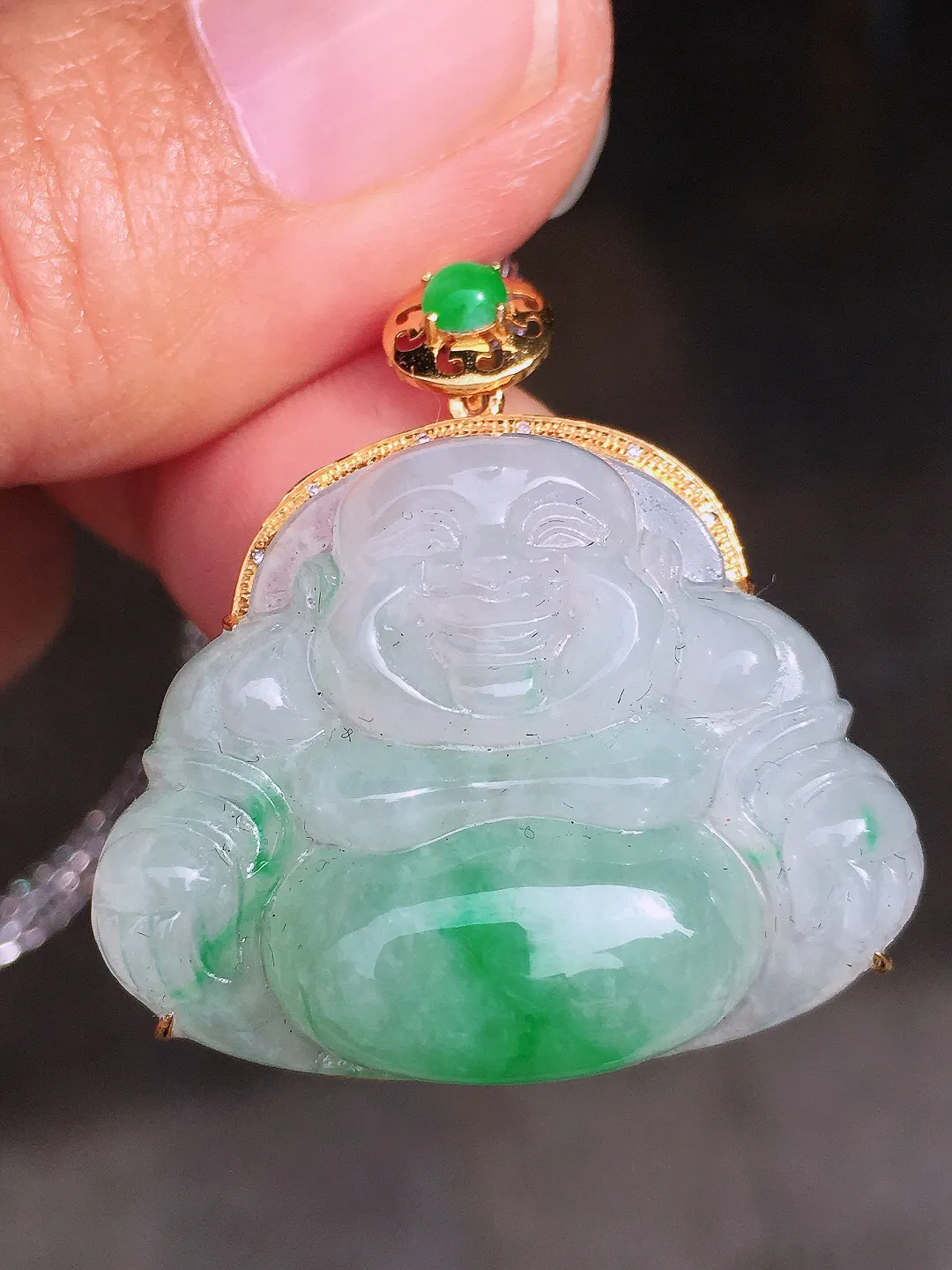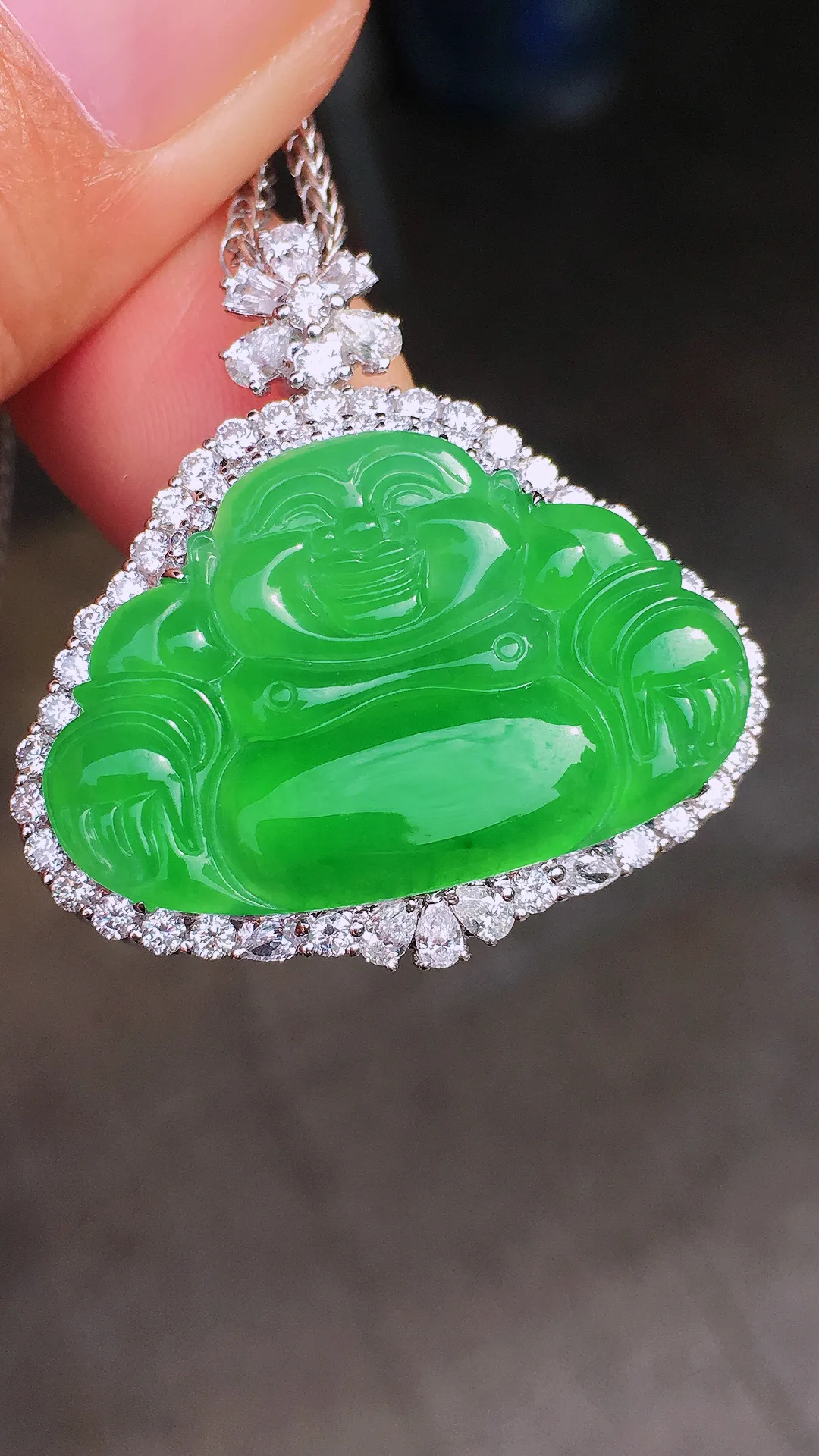 飘绿佛公吊坠,色泽艳丽,玉质细腻,荧光感超 强,饱满圆润,尽显优雅气质,18k 金豪华镶嵌