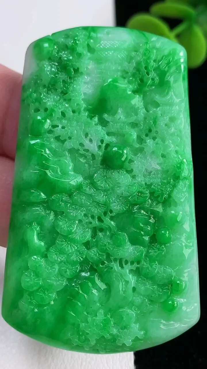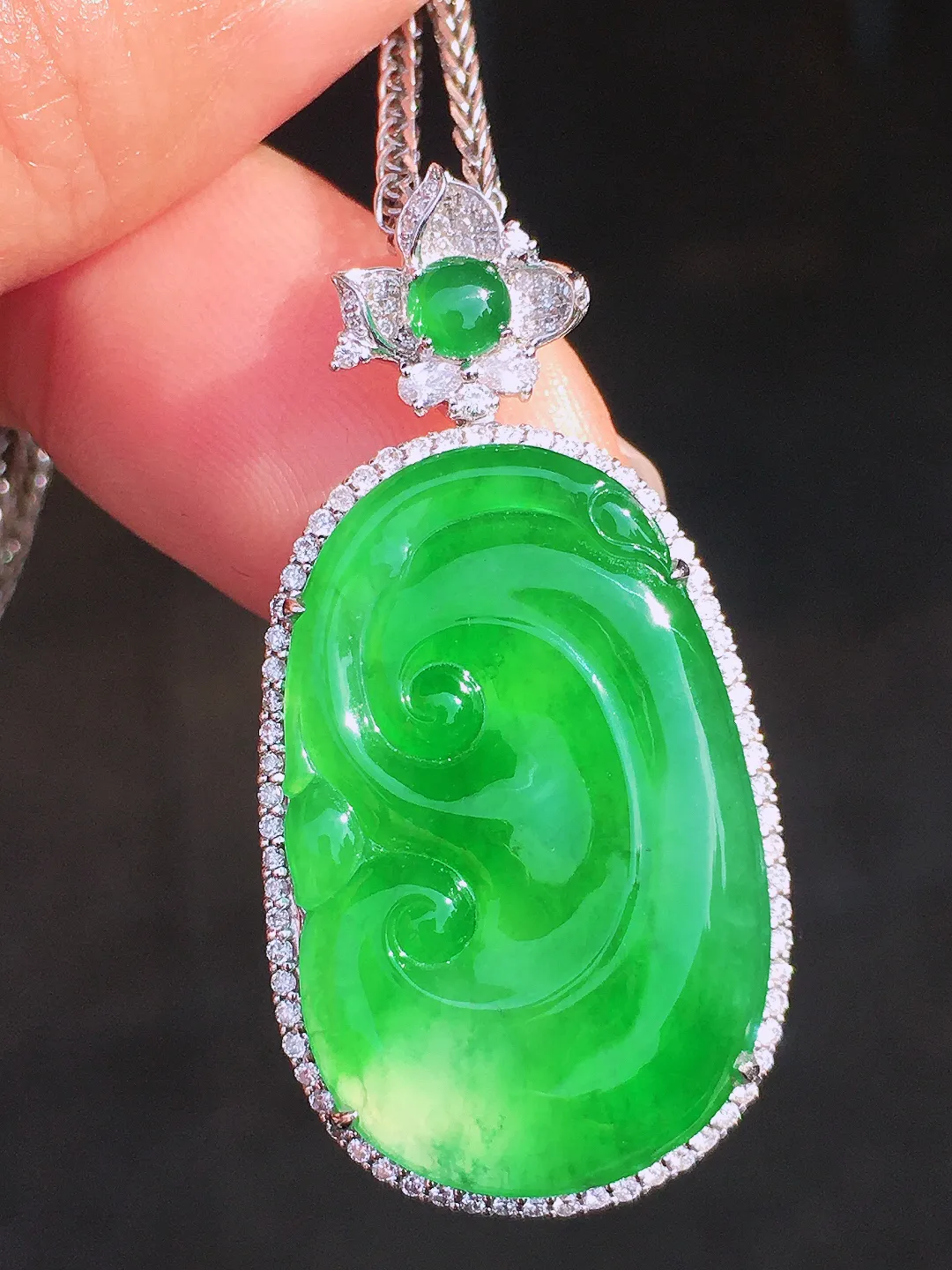阳绿如意吊坠,色泽均匀艳丽,玉质细腻,荧光感超 强,饱满圆润,尽显优雅气质,18k 金豪华镶嵌