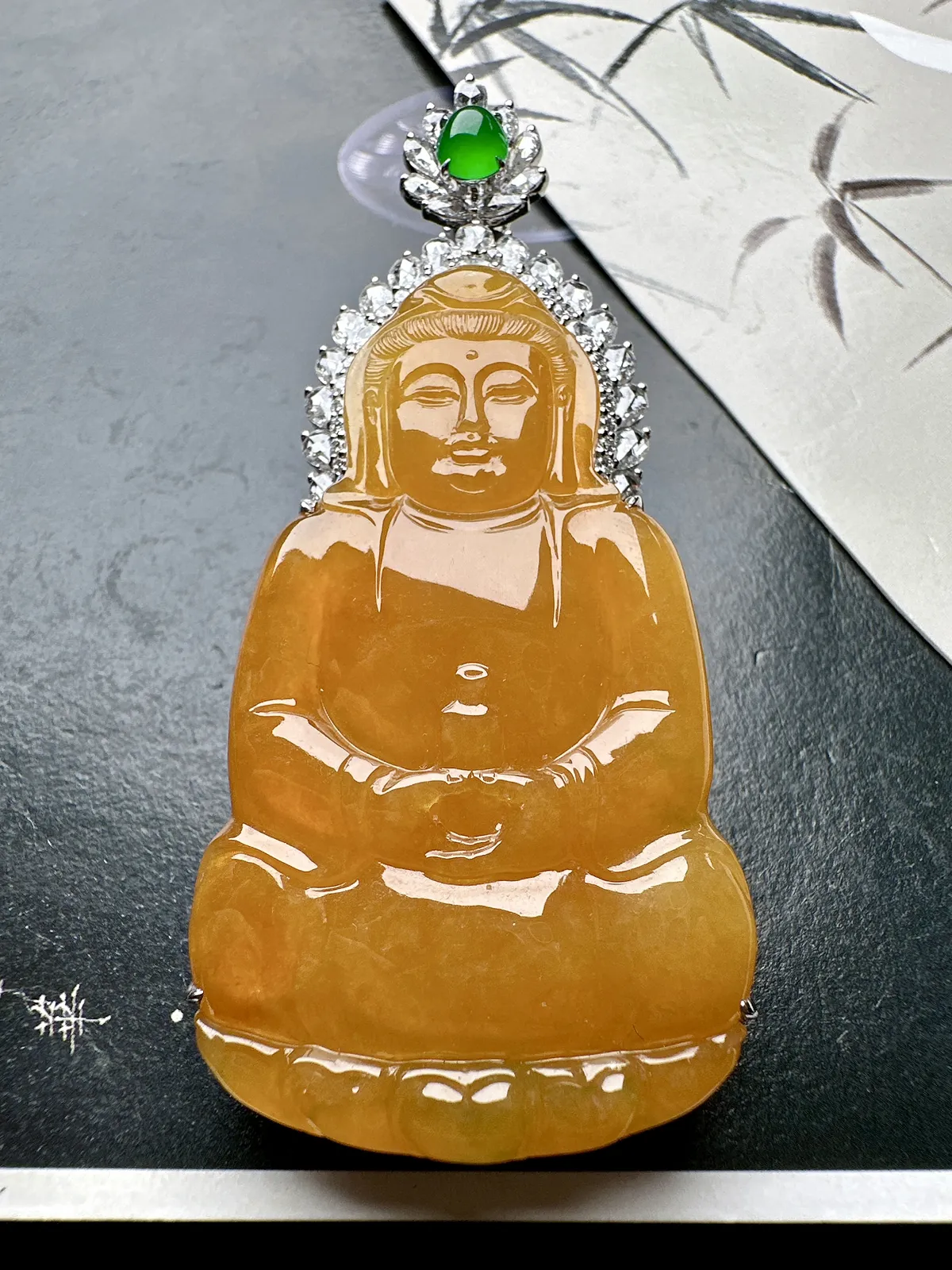 【冰种黄翡观音吊坠】质地细腻,工艺很好,饱满圆润,18k金钻镶嵌,裸石尺寸53.7*32.5*4.5