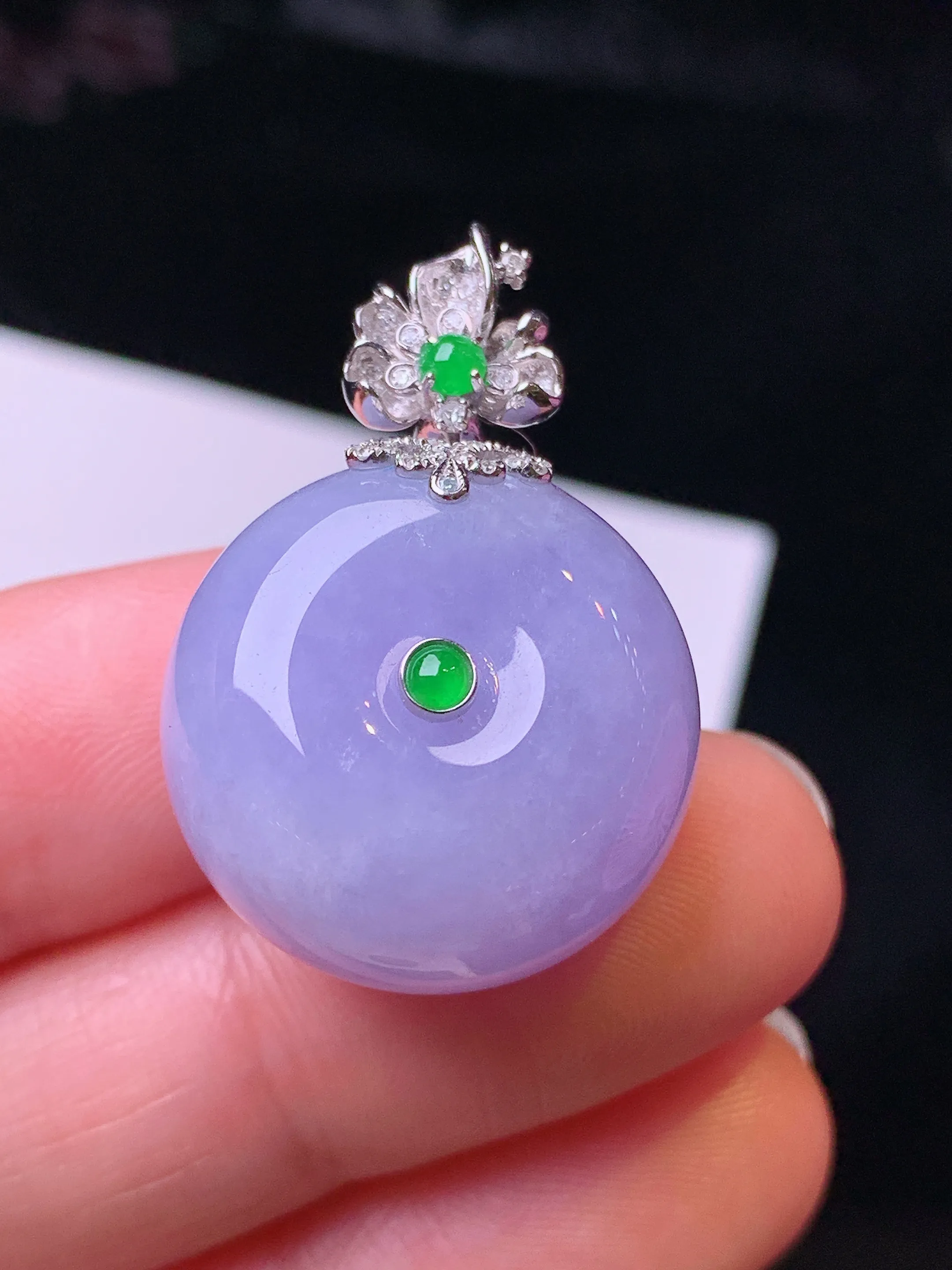 18k金钻镶嵌紫罗兰平安扣吊坠 玉质细腻 水润亮眼 色泽艳丽 整体尺寸29.3*20.2*12.8