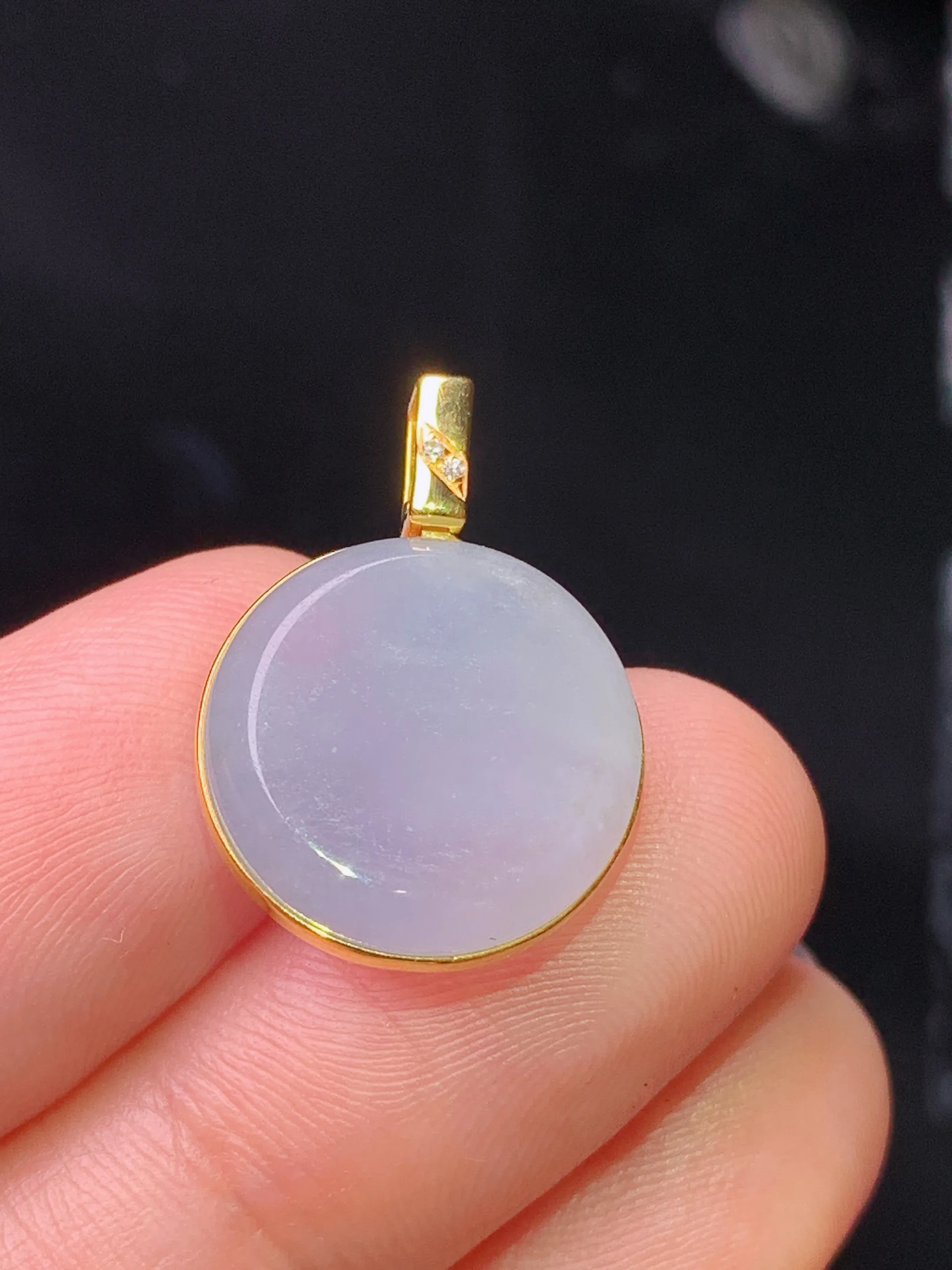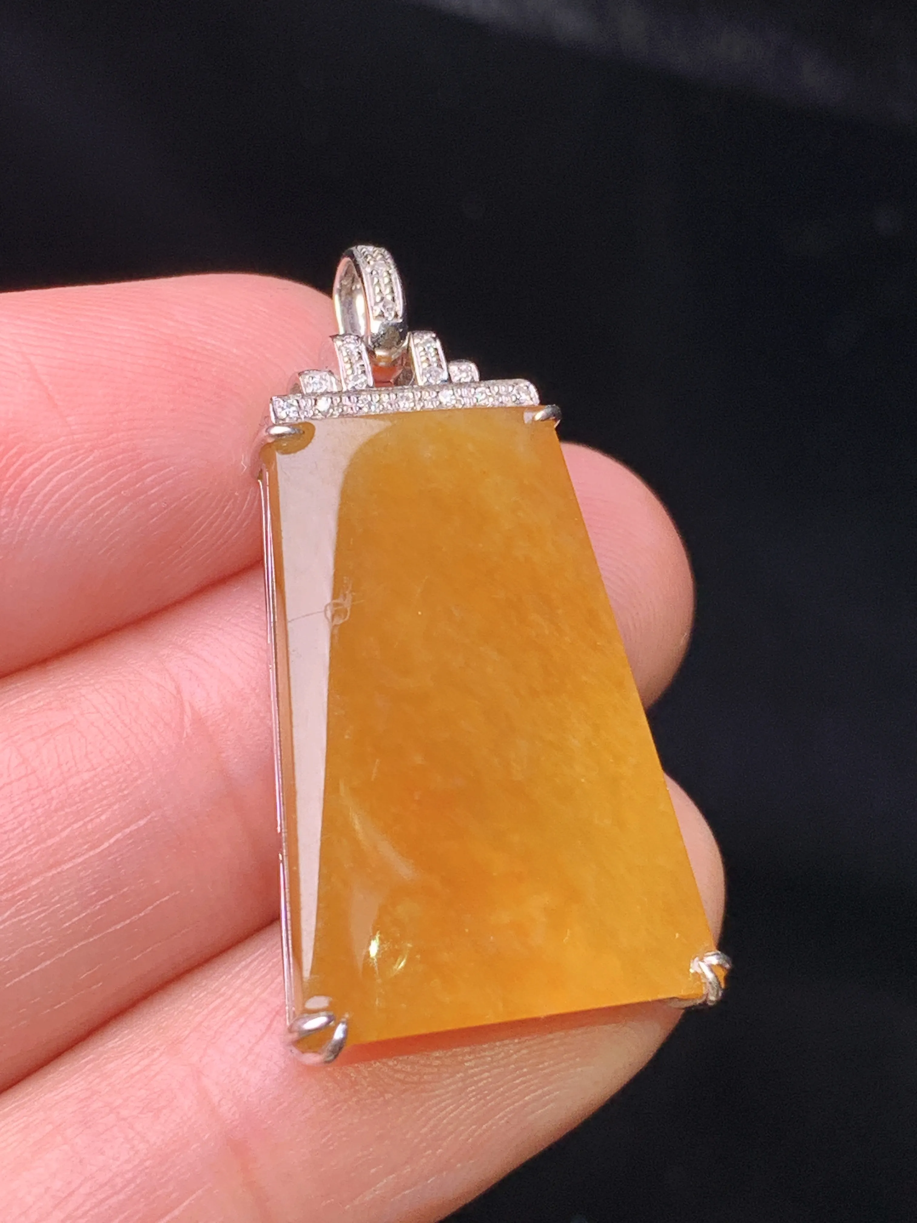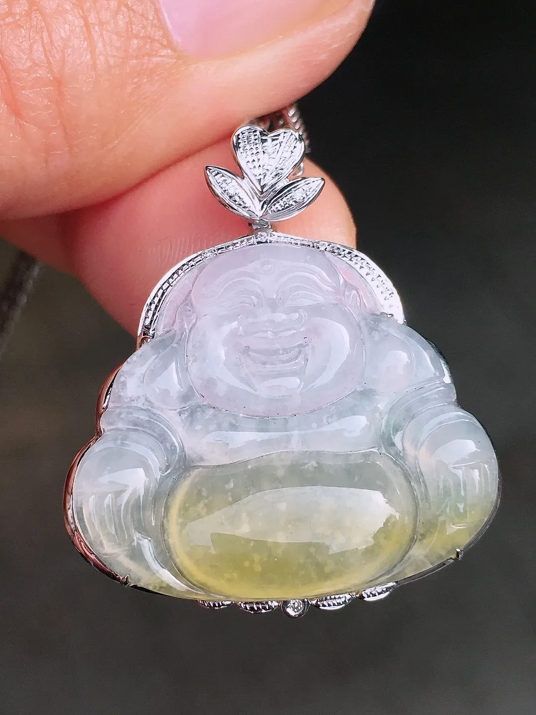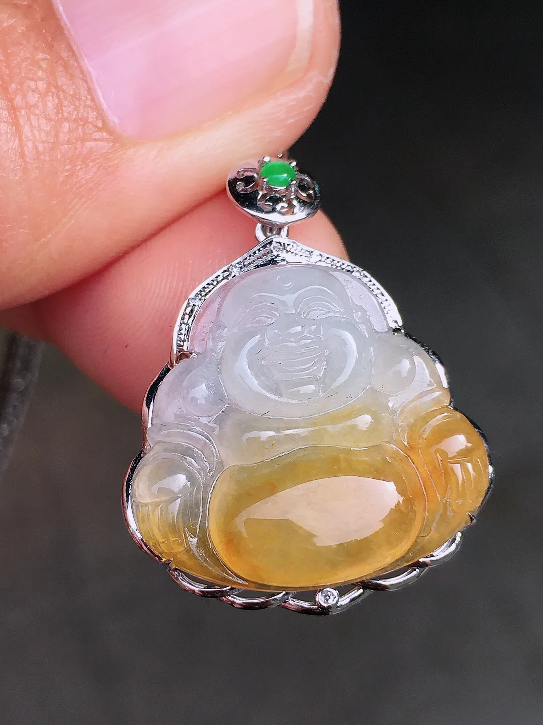 飘黄翡佛公吊坠,色泽艳丽,玉质细腻,荧光感超 强,饱满圆润,尽显优雅气质,18k 金豪华镶嵌