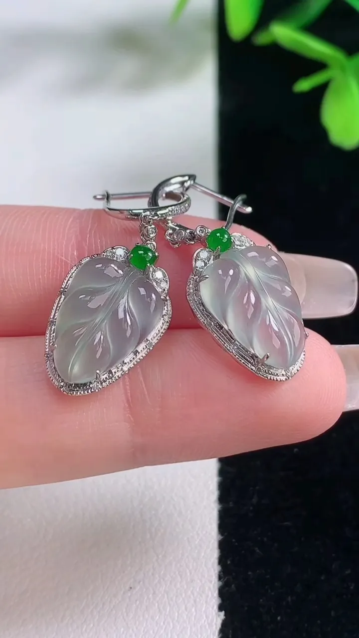 天然A货翡翠种白冰金枝玉叶 叶子耳坠,尺寸13.4-9.8-5.4,重量:4.38g 1月5日