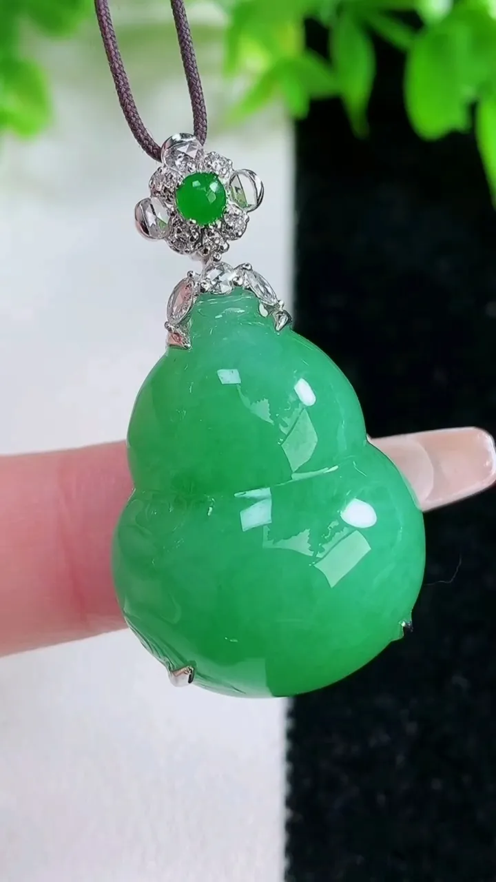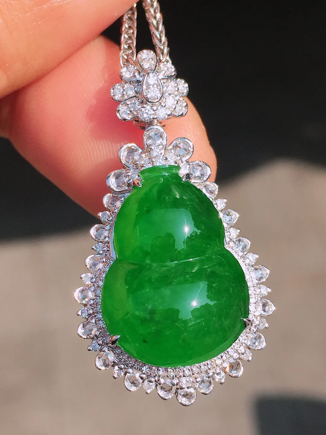 阳绿葫芦吊坠,色泽均匀艳丽,玉质细腻,荧光感超 强,饱满圆润,尽显优雅气质,18k 金豪华镶嵌