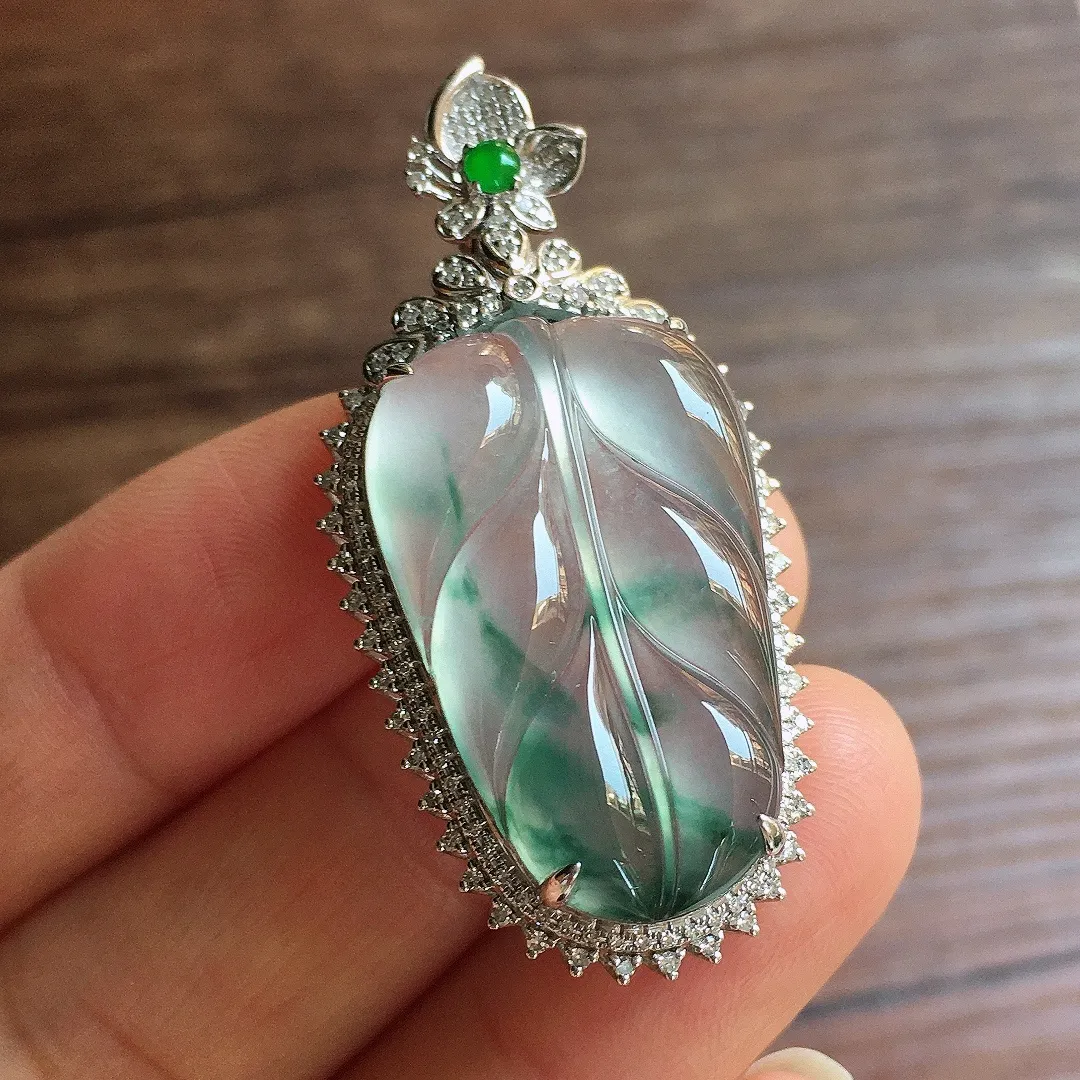 冰飘花树叶吊坠,18k金镶嵌,冰冰润润,玉质细腻,种水足,Ym2 尺寸45*22*9.8
