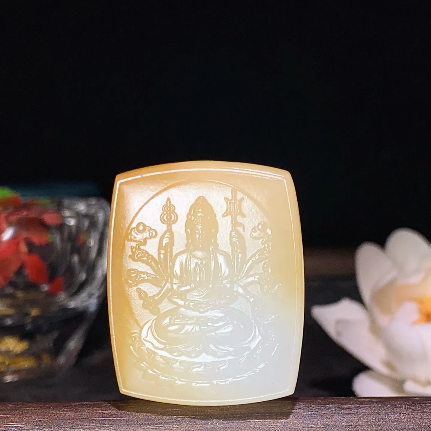 新疆和田玉且末糖千手观音牌子挂件 尺寸36/29/9重23.5克 玉质细腻油润 底色纯净 脂粉好,品