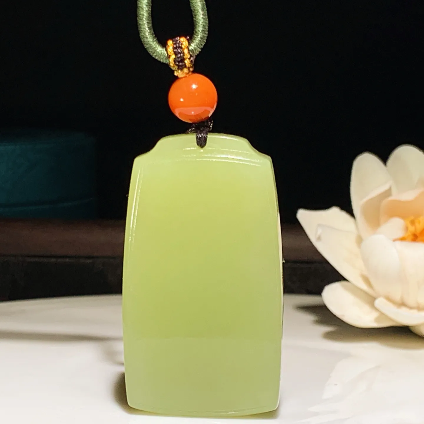 和田玉阳绿俄罗斯碧玉花开富贵牌子挂件 尺寸33/23/6重10克 玉质细腻油润 底色纯净 脂粉好,品