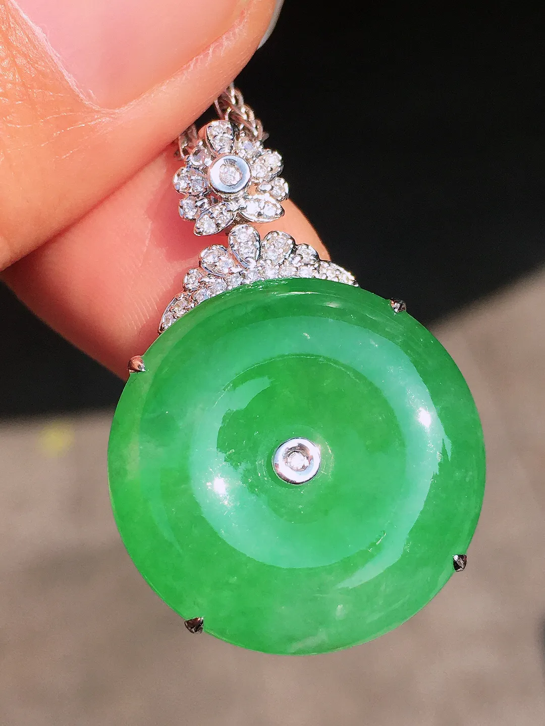 阳绿平安扣吊坠,色泽均匀艳丽,玉质细腻,荧光感超 强,饱满圆润,尽显优雅气质,18k 金豪华镶嵌