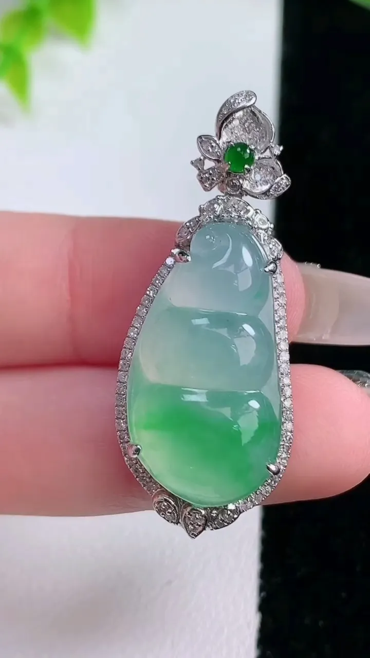 18k金钻镶嵌翠绿福瓜吊坠 玉质细腻 色泽艳丽清新 整体尺寸34.5*10.5*10