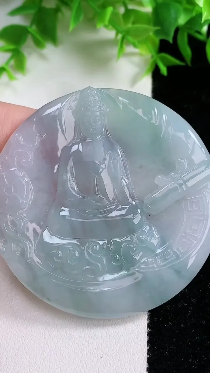 天然A货翡翠冰种飘花观音菩萨吊坠,尺寸66.2-41.8-4.6,重量:33.45g 1月25日