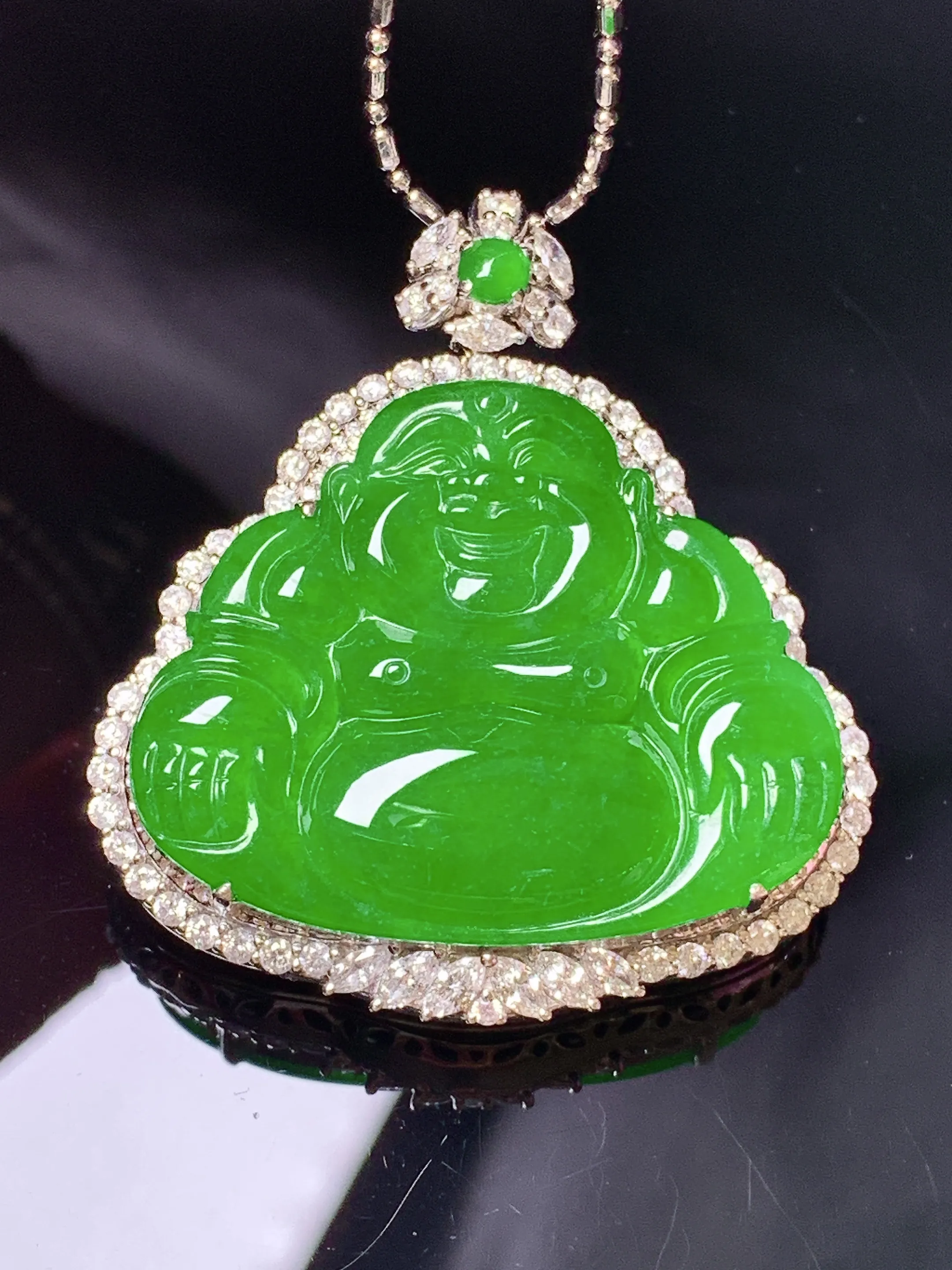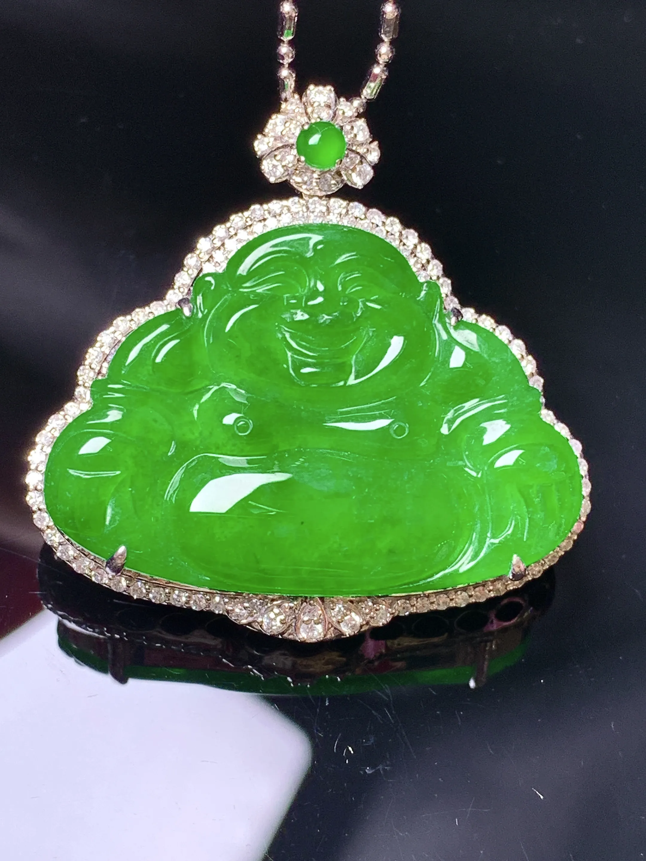 18k金钻镶嵌满绿佛公吊坠 玉质细腻 色泽艳丽清新 整体尺寸40*36*11.6