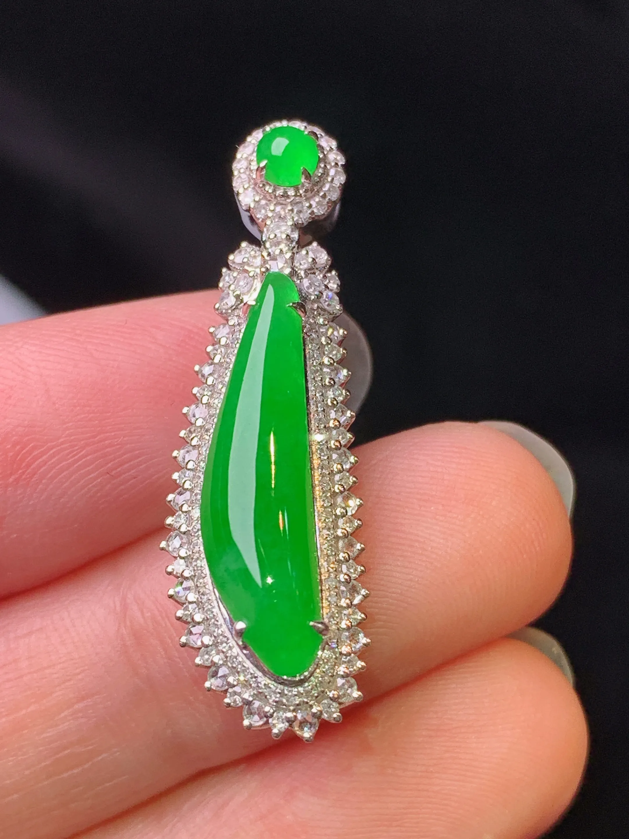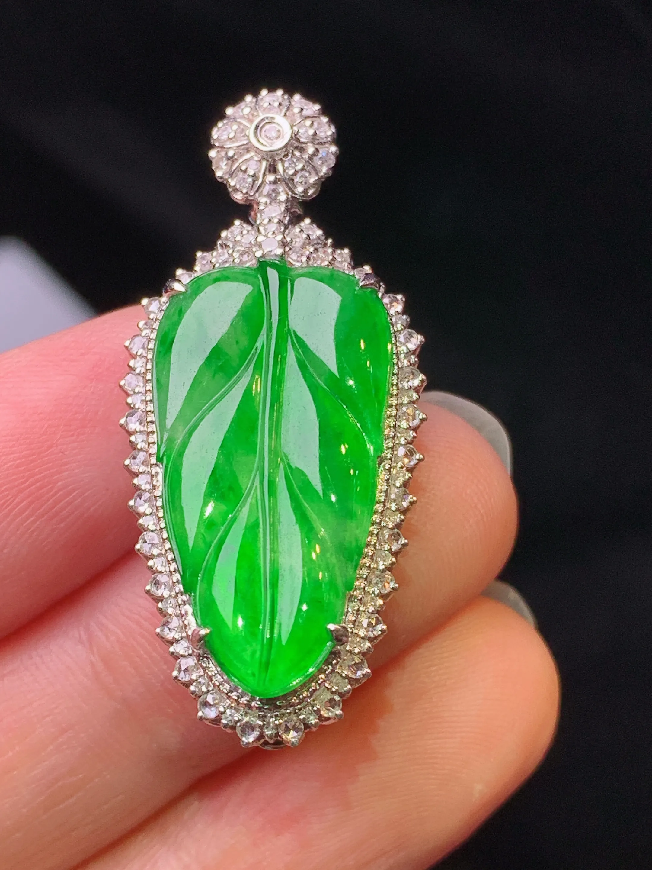 18k金钻镶嵌翠绿树叶吊坠 玉质细腻 色泽艳丽清新 整体尺寸36.6*16.3*9.5