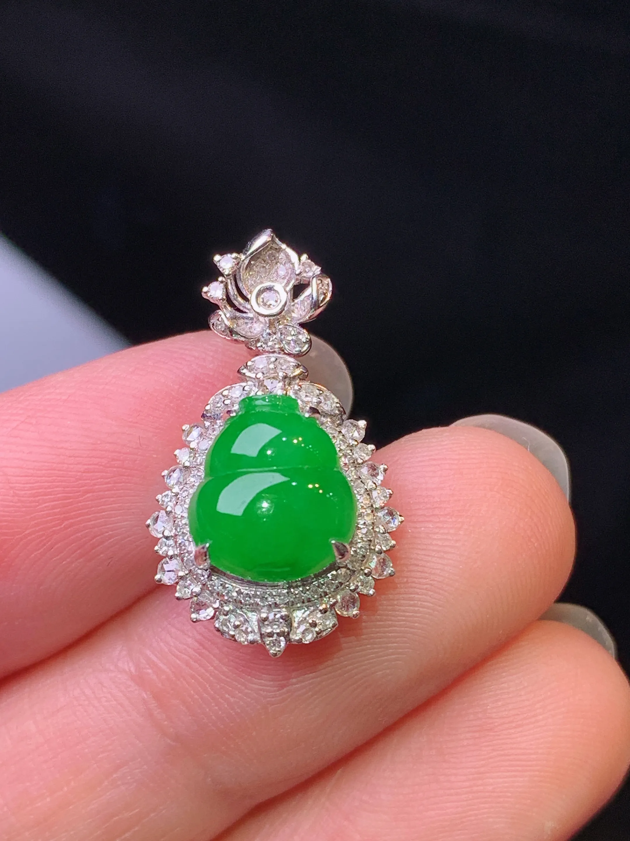 18k金钻镶嵌满绿葫芦吊坠 玉质细腻 色泽艳丽清新 整体尺寸22.5*13.2*8.8