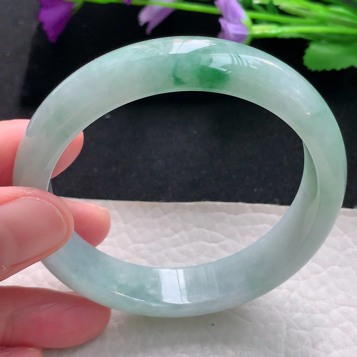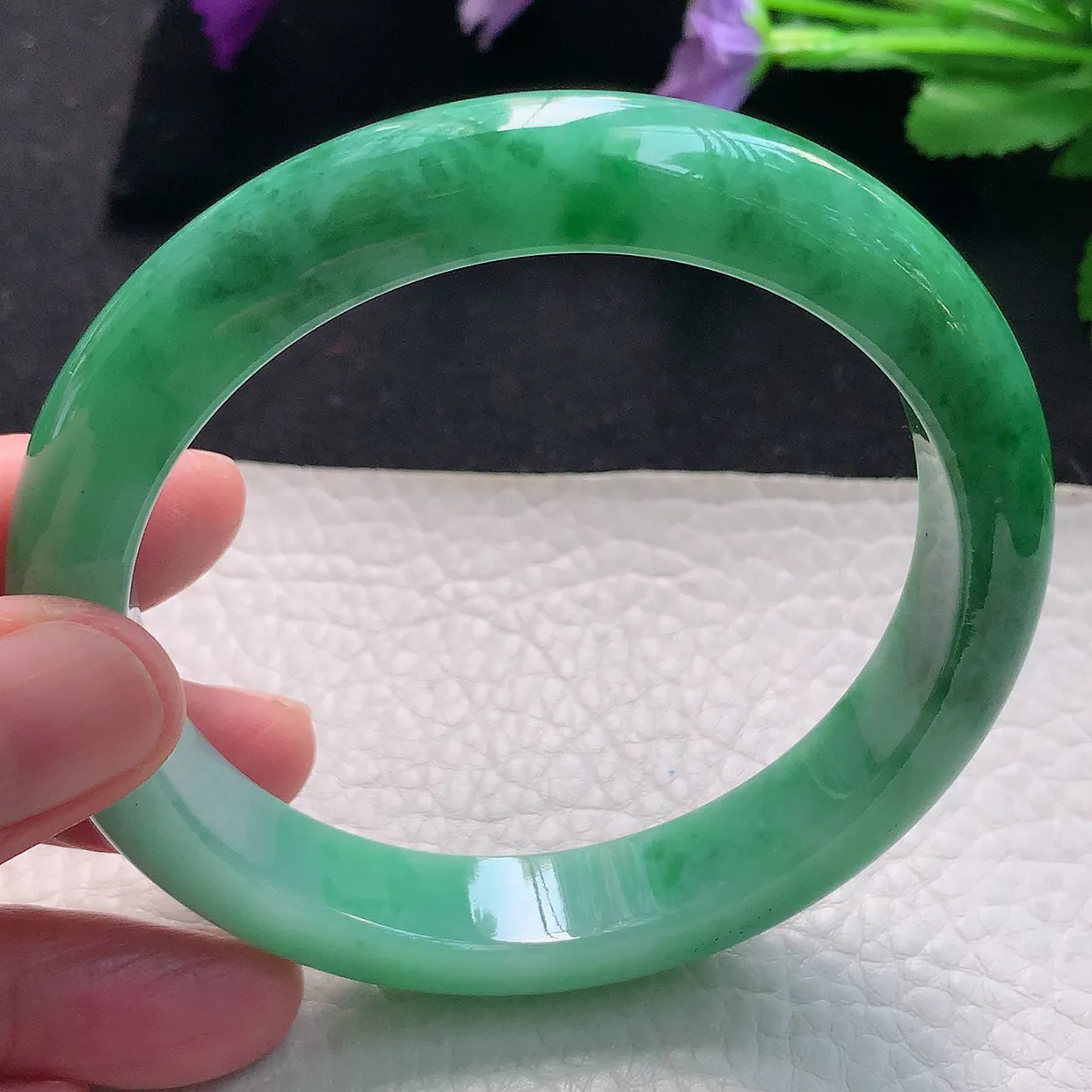 js自然光58*14*7.5平安镯 天然缅甸翡翠手镯飘绿正圈宽边镯子玉手环