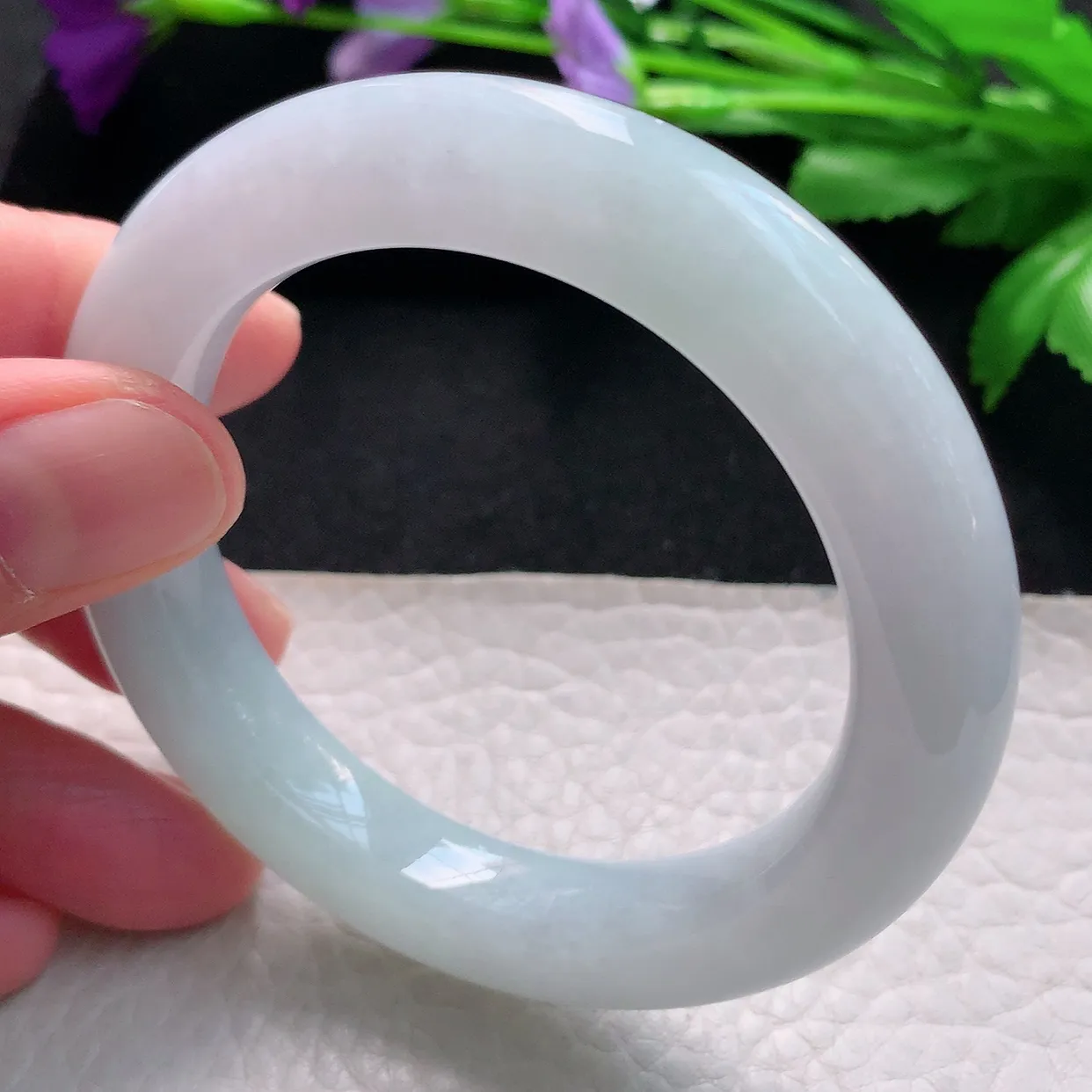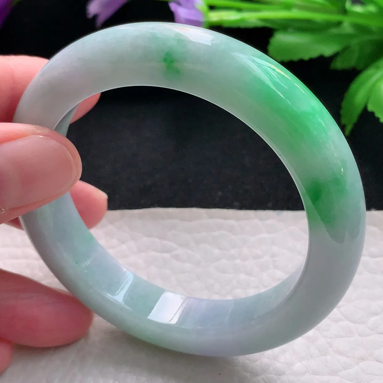 js自然光53.5*11.4*9.2平安镯 天然缅甸翡翠手镯白底青飘阳绿正圈宽边镯子