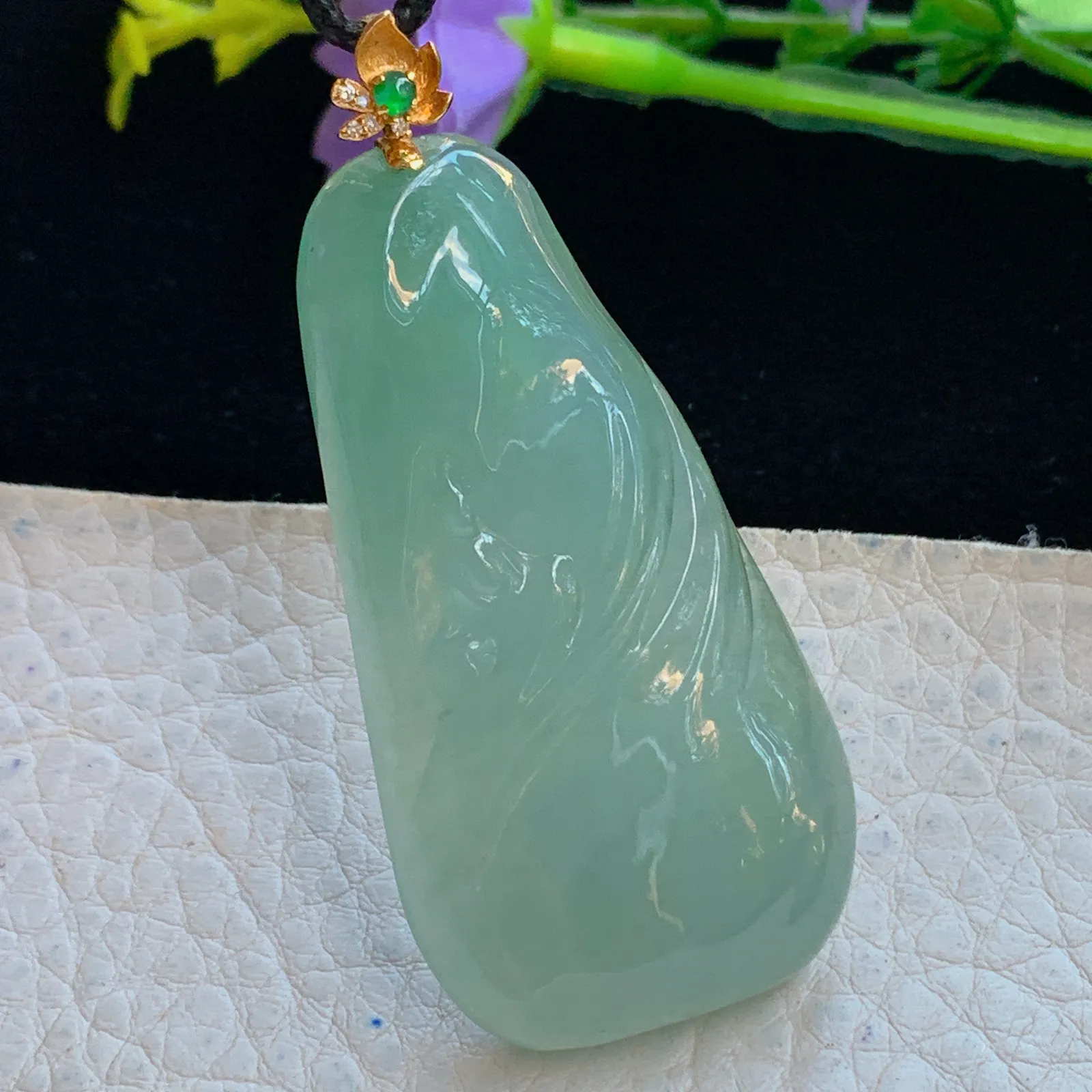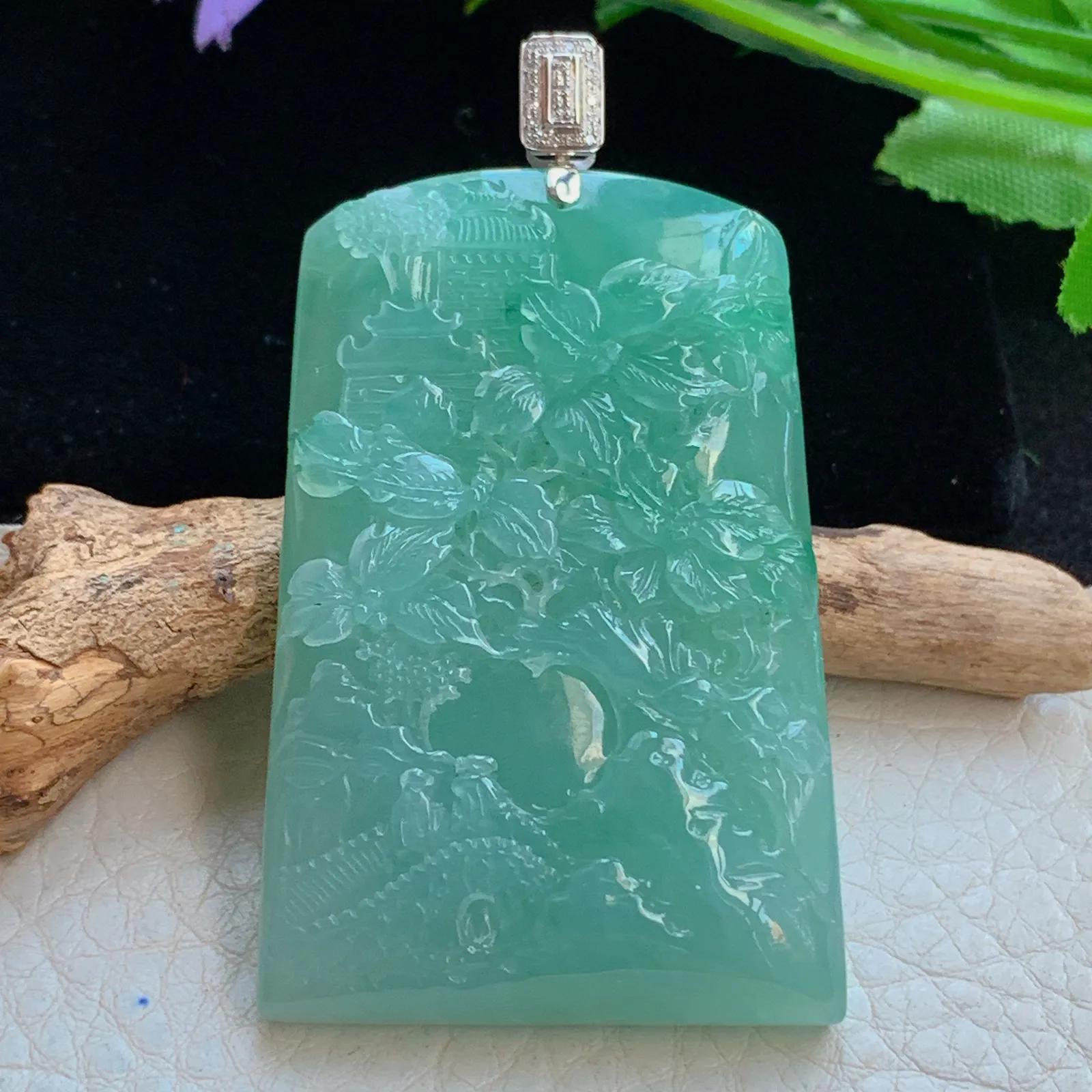 yl实拍52.2*34.5*8.8缅甸翡翠a货冰绿山水 大好河山玉吊坠 玉挂件