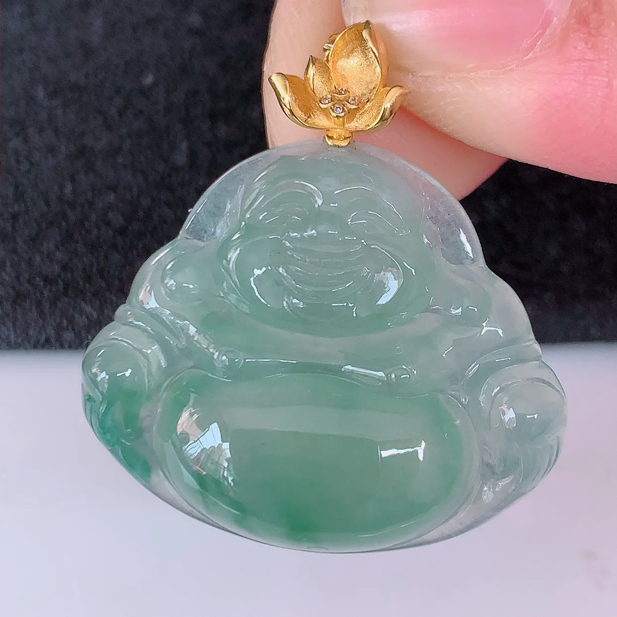 自然光实拍,18K金镶嵌冰种飘花翡翠佛公吊坠,款式新颖,佩戴效果时尚出众,尽显气质,玉质细腻,美感十
